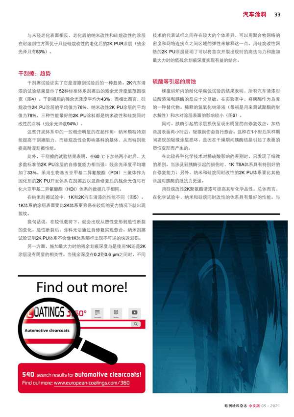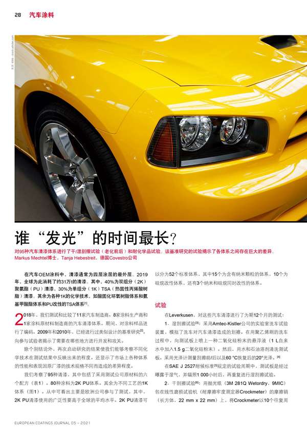 摘要:對95種汽車清漆體系進行了干/濕刮擦試驗(老化前后)和耐化學品試驗。該基準研究的試驗揭示了各體系之間存在巨大的差異。