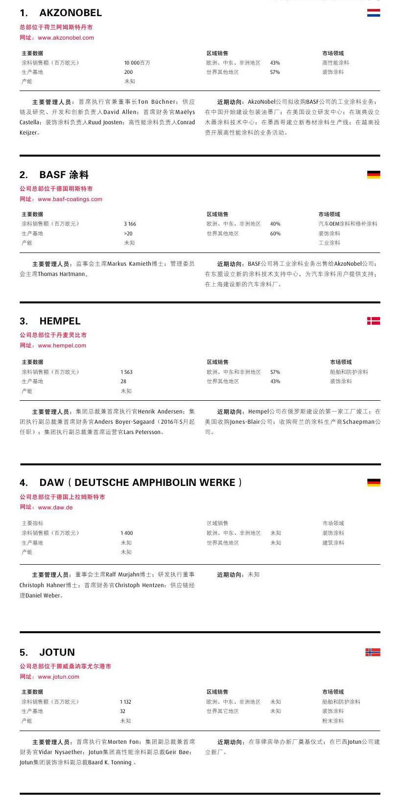 最近,在全球涂料行業中,很多公司都在力爭取得頭號種子的地位。去年,AkzoNobel公司失去了頭把交椅的位置,被PPG公司取而代之。就最近的發展情況來看,Sherwin-Williams公司在完成對Valspar公司收購后,將成為全球最大的涂料生產商。在全球100強涂料公司中,許多公司的總部都位于歐洲。