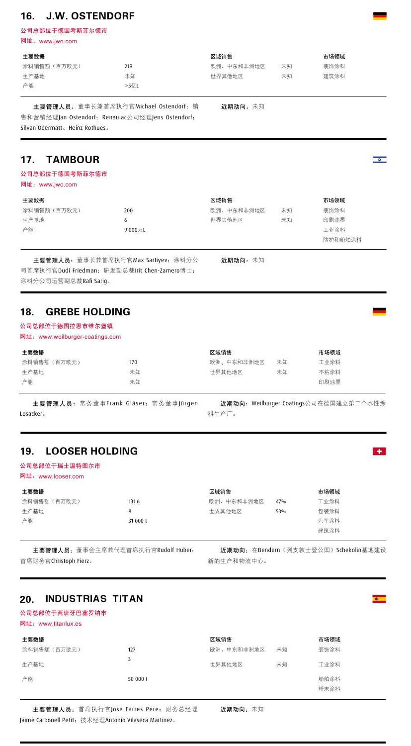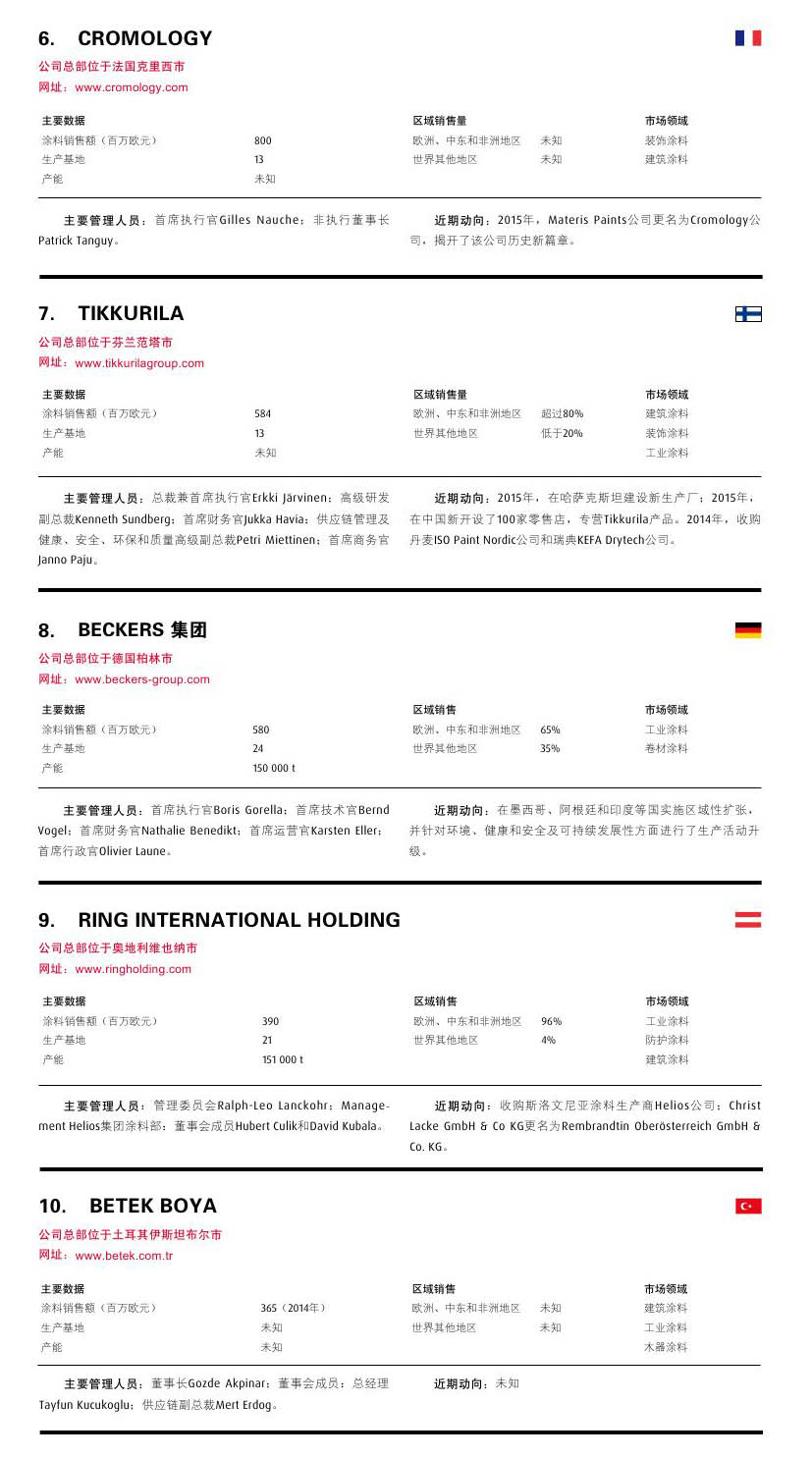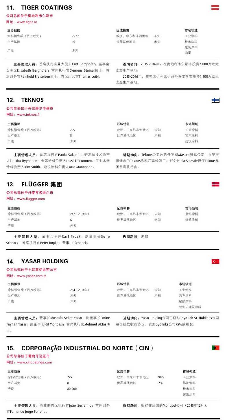 在歐洲,有很多涂料生產商積極活躍在涂料行業。《歐洲涂料雜志》根據各公司的收益情況,對總部設在歐洲大陸的歐洲涂料行業前25名進行了排行。