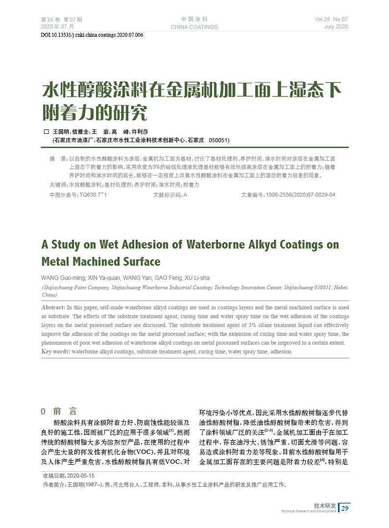 本文系作者@王國明,信雅全,王 巖,高 峰,許利莎 授權(quán)中國涂料網(wǎng)發(fā)表,并經(jīng)中國涂料網(wǎng)編輯,未經(jīng)允許不得轉(zhuǎn)載,如需轉(zhuǎn)載請(qǐng)聯(lián)系chinacoatingnet@vip.163.com