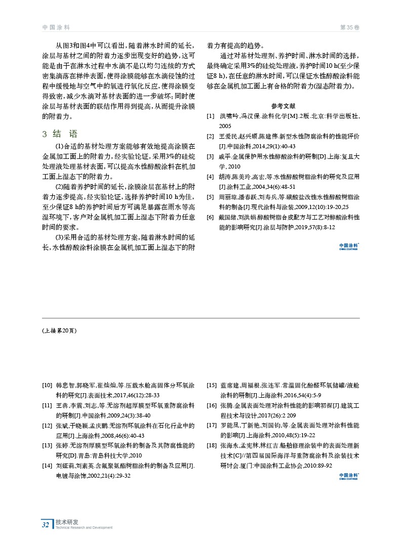 摘要:以自制的水性醇酸涂料為涂層,金屬機(jī)加工面為基材,討論了基材處理劑、養(yǎng)護(hù)時(shí)間、淋水時(shí)間對(duì)涂層在金屬加工面上濕態(tài)下附著力的影響。采用濃度為3%的硅烷處理液處理基材能夠有效地提高涂層在金屬加工面上的附著力;隨著養(yǎng)護(hù)時(shí)間和淋水時(shí)間的延長,能夠在一定程度上改善水性醇酸涂料在金屬加工面上的濕態(tài)附著力較差的現(xiàn)象。
