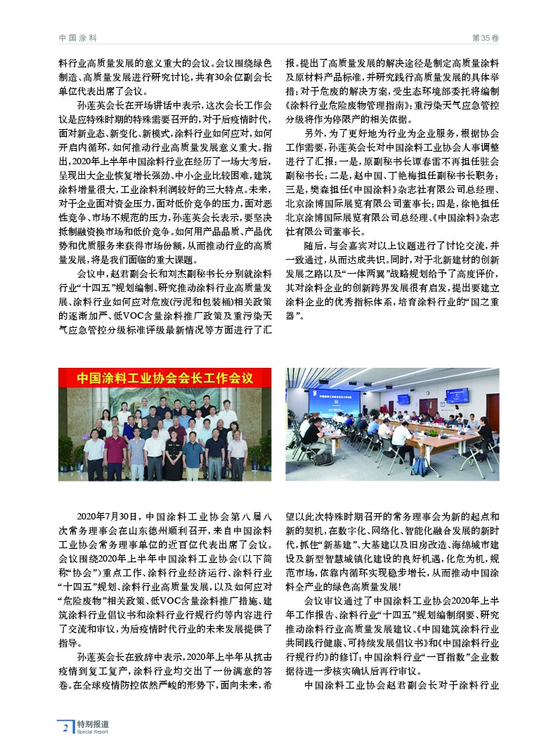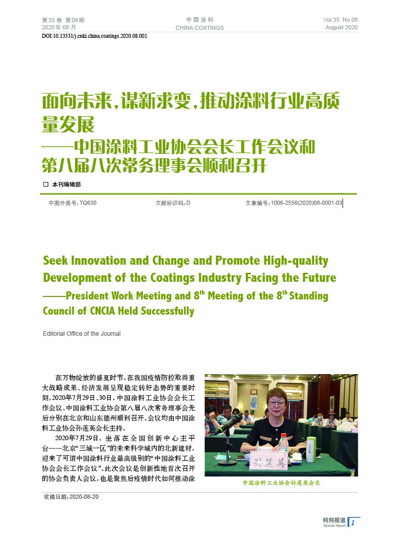 編者按:2020年7月29日、30日,中國涂料工業協會會長工作會議、中國涂料工業協會第八屆八次常務理事會先后分別在北京和山東德州順利召開。會議均由中國涂料工業協會孫蓮英會長主持。