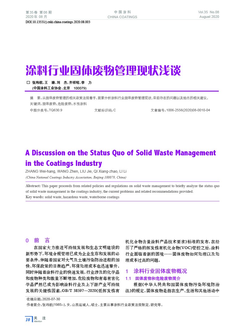 從固體廢物管理的相關政策法規(guī)著手,簡要分析涂料行業(yè)固體廢物管理現狀、目前存在的問題以及給出的相關建議。
