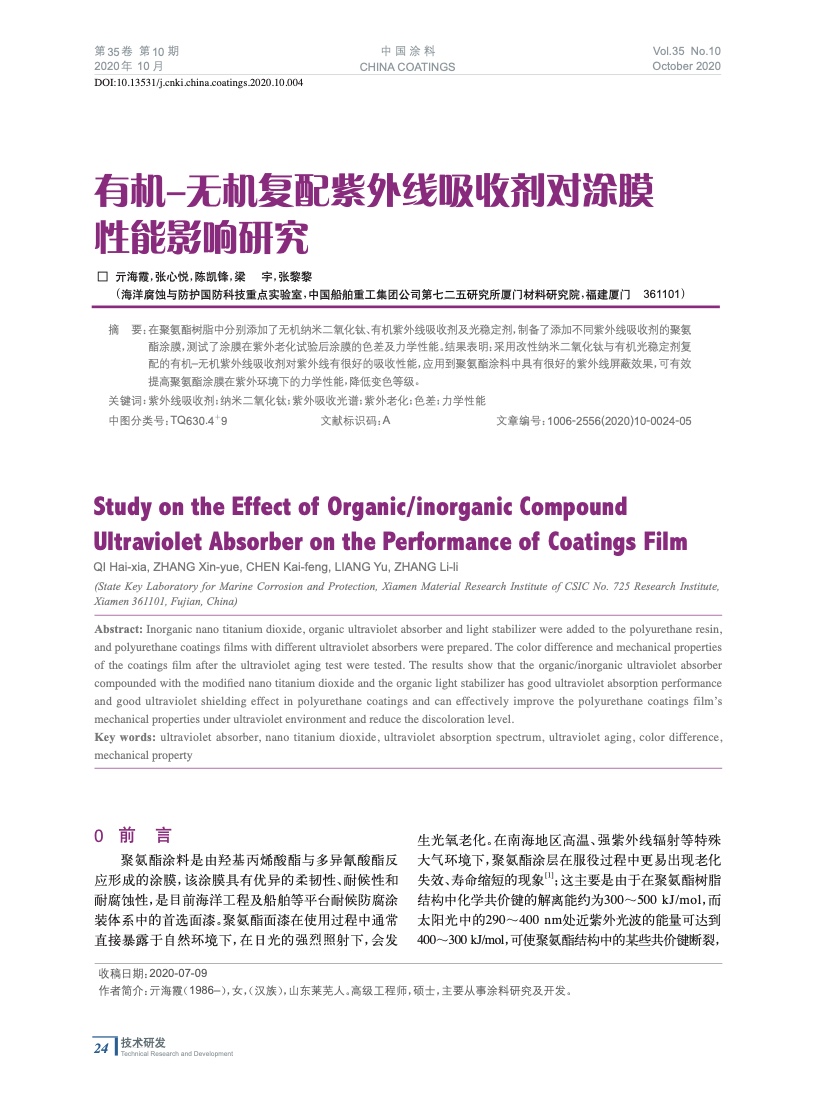 有機−無機復配紫外線吸收劑對涂膜性能影響研究