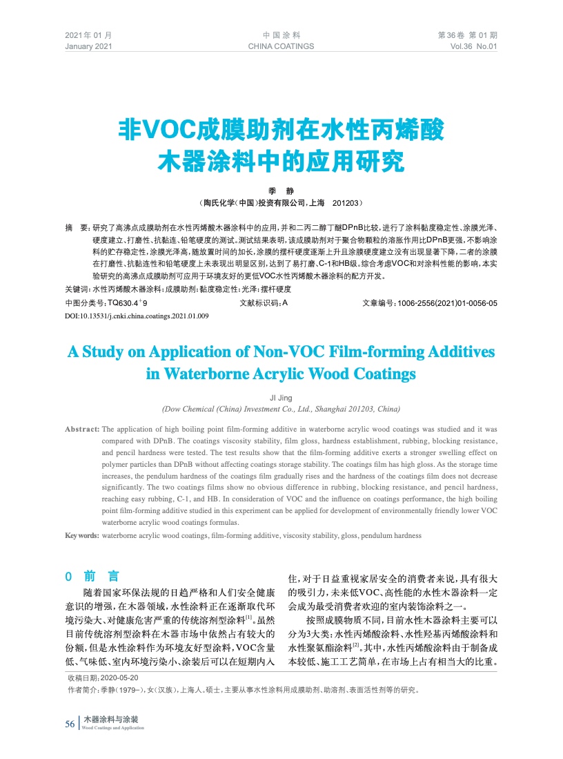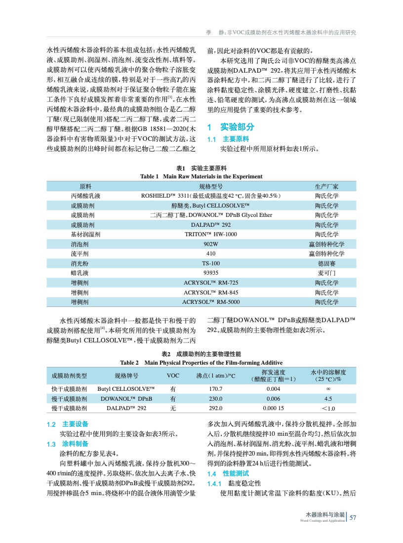 非VOC成膜助劑在水性丙烯酸木器涂料中的應用研究