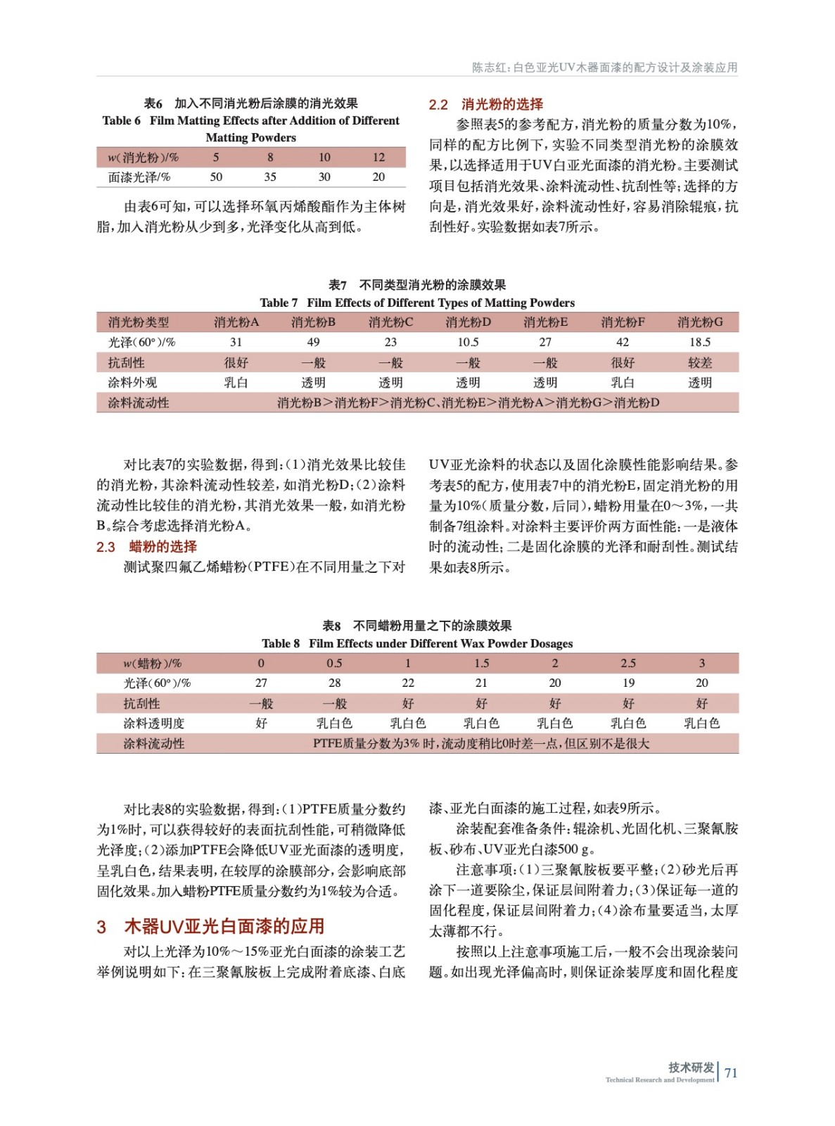 以環氧丙烯酸酯為主體樹脂,討論了環氧丙烯酸酯、啞粉、蠟粉對亞光白面漆性能的影響,最終獲得了木器亞光白色UV面漆的配方設計最佳方案及涂裝方法。涂裝效果證實,本實驗制備的白色UV面漆表面消光效果好、手感好、遮蓋力好,有較強的實用價值。