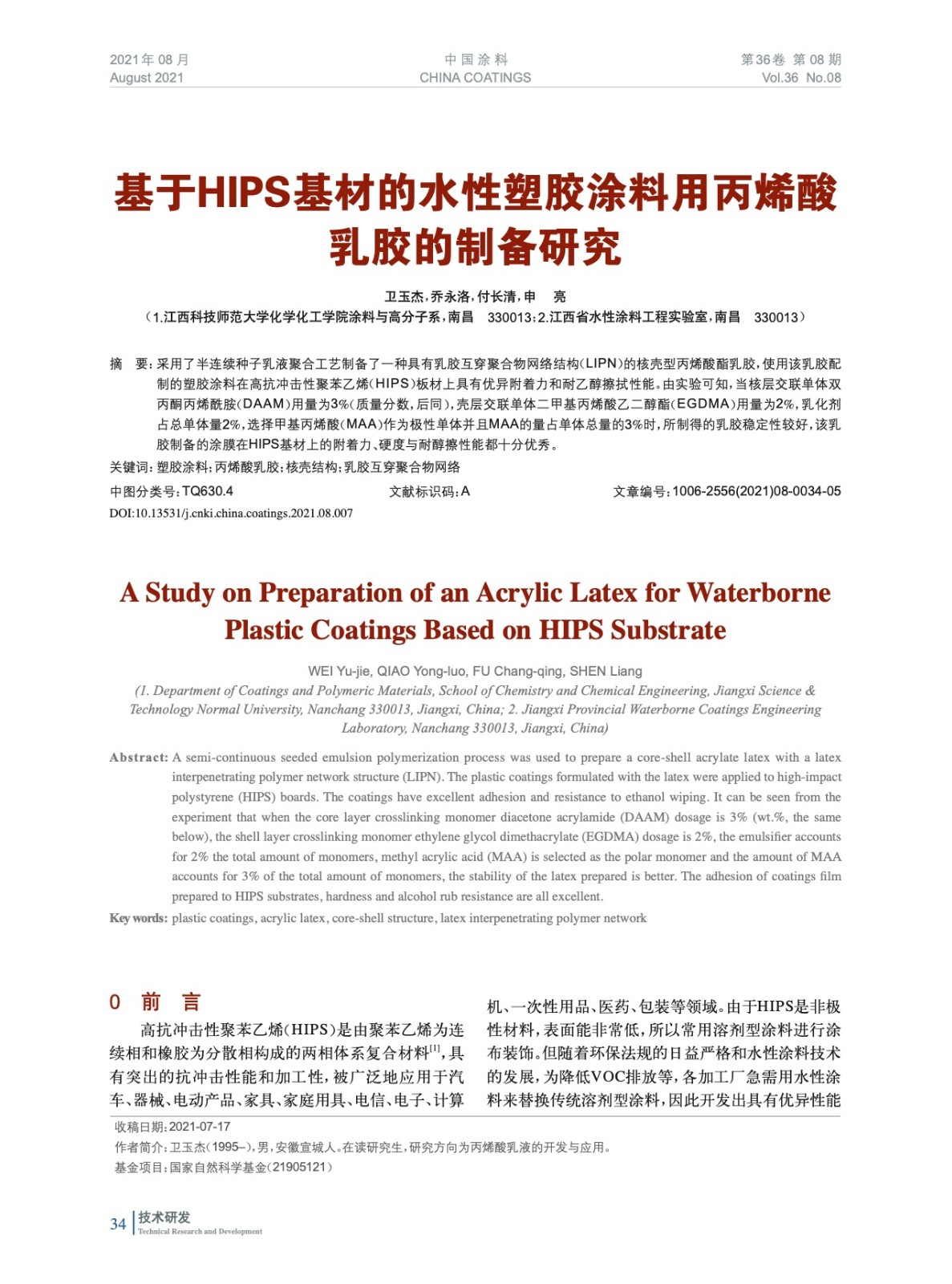 基于HIPS基材的水性塑膠涂料用丙烯酸乳膠的制備研究