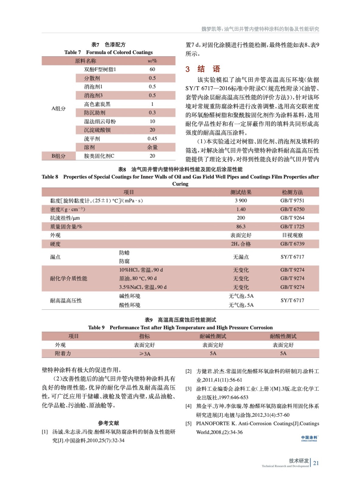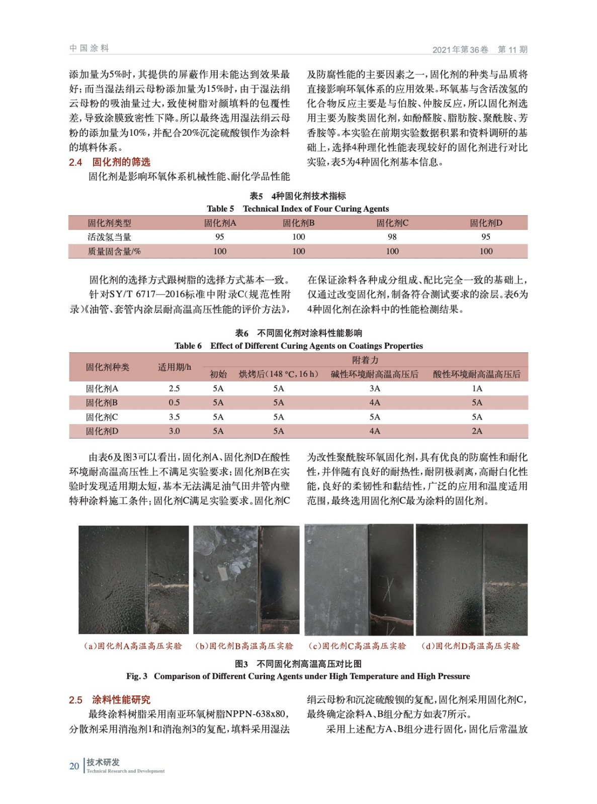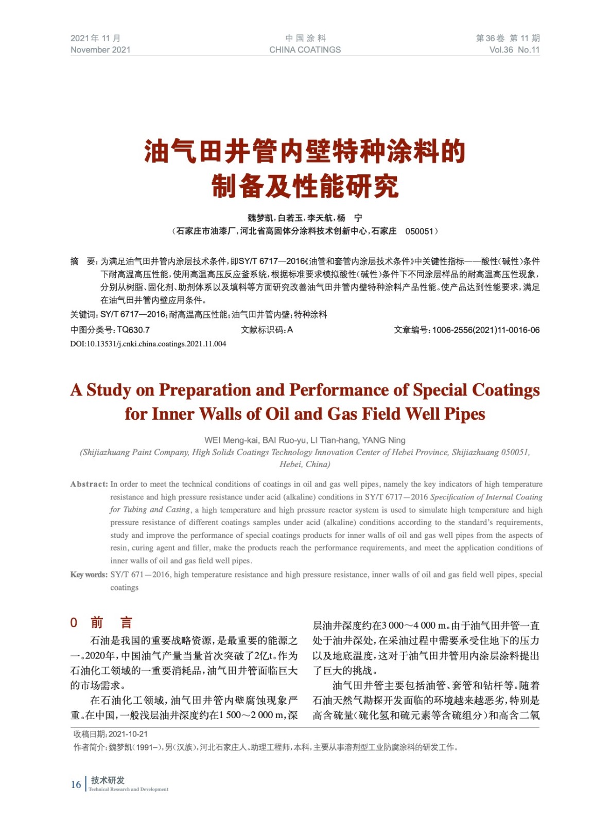 摘要:為滿足油氣田井管內(nèi)涂層技術(shù)條件,即SY/T 6717—2016《油管和套管內(nèi)涂層技術(shù)條件》中關(guān)鍵性指標(biāo)——酸性(堿性)條件下耐高溫高壓性能,使用高溫高壓反應(yīng)釜系統(tǒng),根據(jù)標(biāo)準(zhǔn)要求模擬酸性(堿性)條件下不同涂層樣品的耐高溫高壓性現(xiàn)象,分別從樹脂、固化劑、助劑體系以及填料等方面研究改善油氣田井管內(nèi)壁特種涂料產(chǎn)品性能。使產(chǎn)品達(dá)到性能要求,滿足在油氣田井管內(nèi)壁應(yīng)用條件。