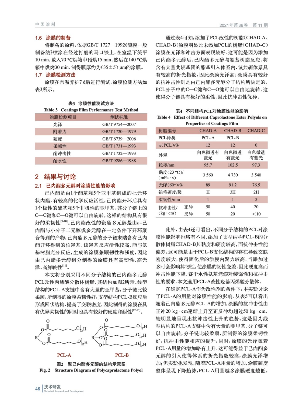摘要:以己內(nèi)酯改性聚酯多元醇PCL-A作為活性稀釋劑,制備出了高光澤高抗沖擊性的羥基丙烯酸二級分散體,實驗結(jié)果表明:當(dāng)以丙二醇丁醚和醋酸丁酯組成的混合溶劑作為聚合介質(zhì),PCL-A質(zhì)量分?jǐn)?shù)為12%,分子量約為7800,酸值為11 mgKOH/g時合成的丙烯酸分散體具有優(yōu)異的光澤和機(jī)械性能,其與氨基樹脂配合制成的水性氨基烤漆具有優(yōu)異的光澤、鮮映性和抗沖擊性,能很好地滿足水性氨基烤漆在高溫烘烤后的性能要求。