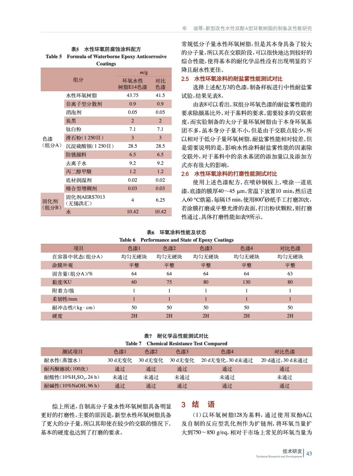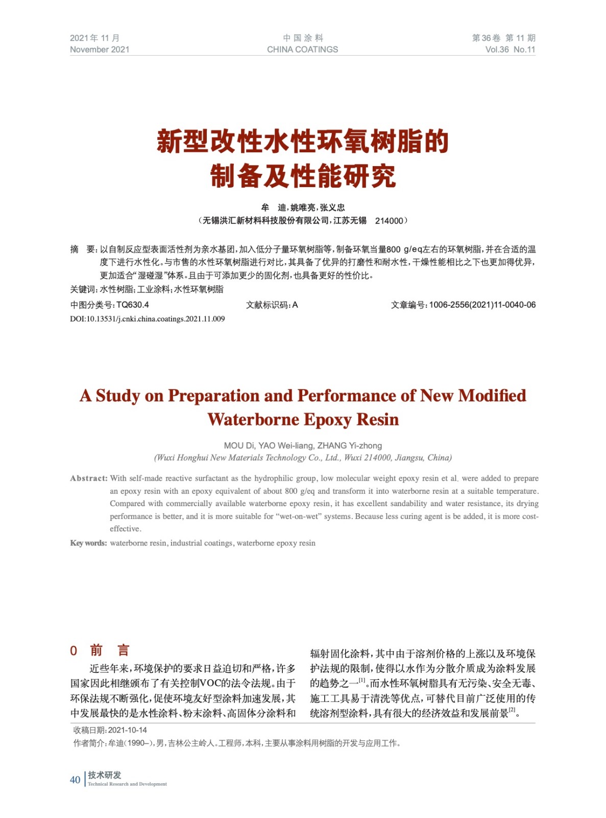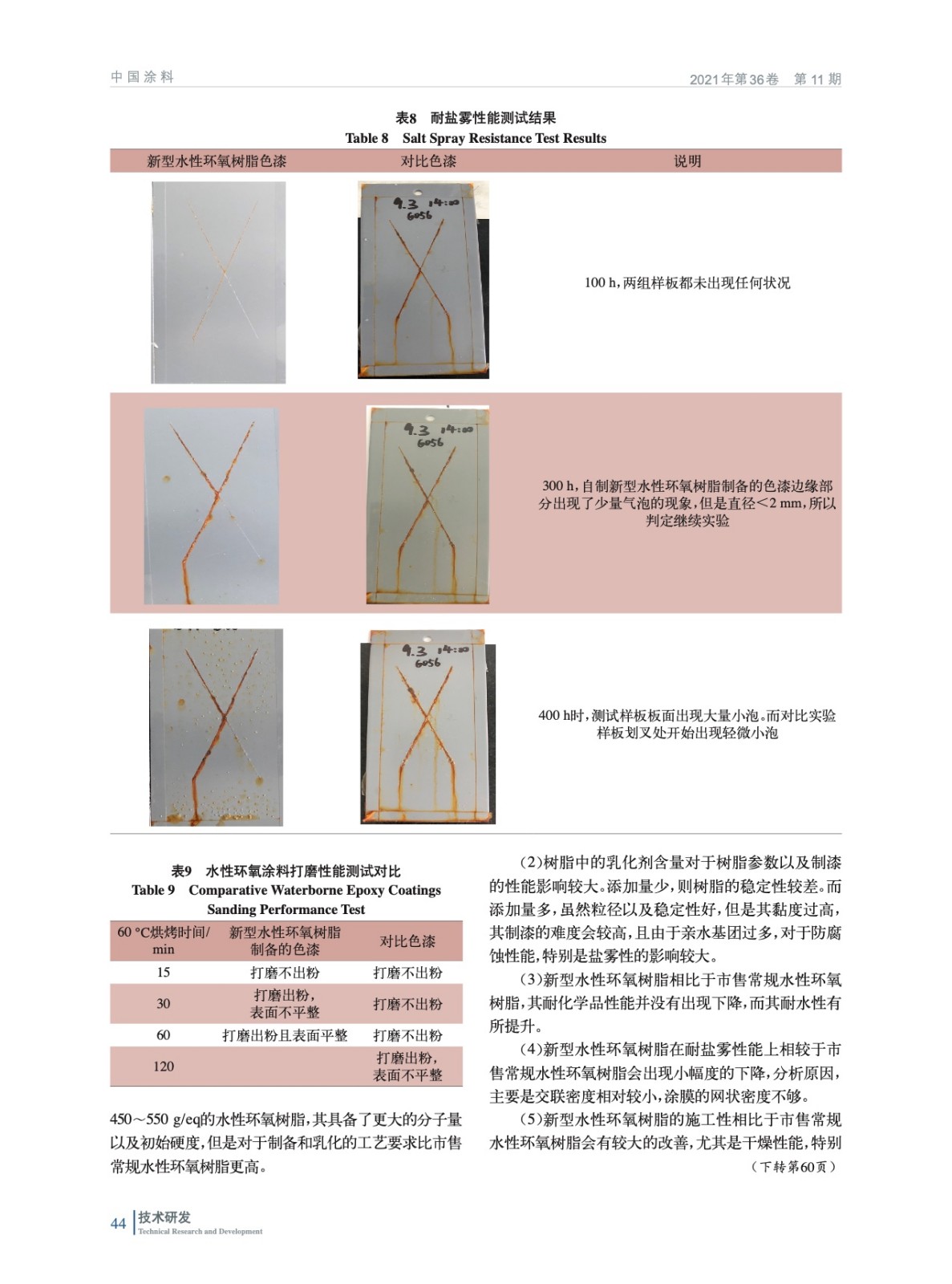 摘要:以自制反應型表面活性劑為親水基團,加入低分子量環氧樹脂等,制備環氧當量800 g/eq左右的環氧樹脂,并在合適的溫度下進行水性化。與市售的水性環氧樹脂進行對比,其具備了優異的打磨性和耐水性,干燥性能相比之下也更加得優異,更加適合“濕碰濕”體系。且由于可添加更少的固化劑,也具備更好的性價比。