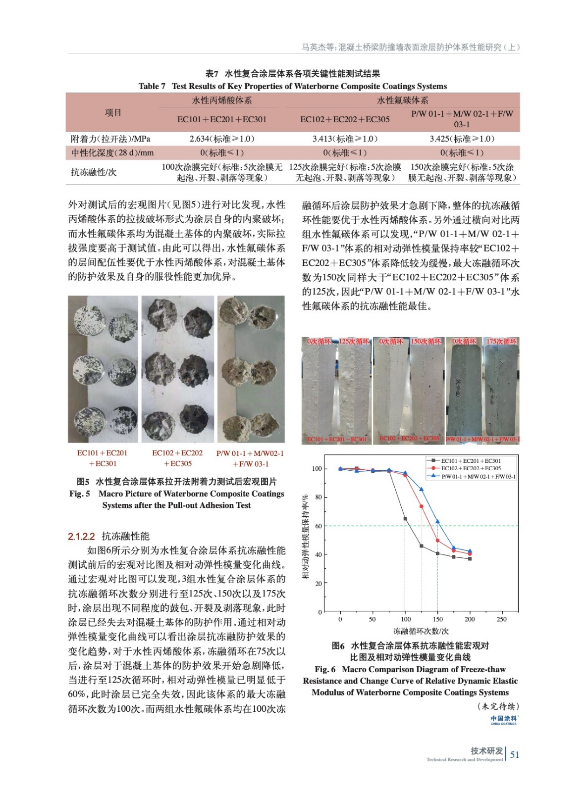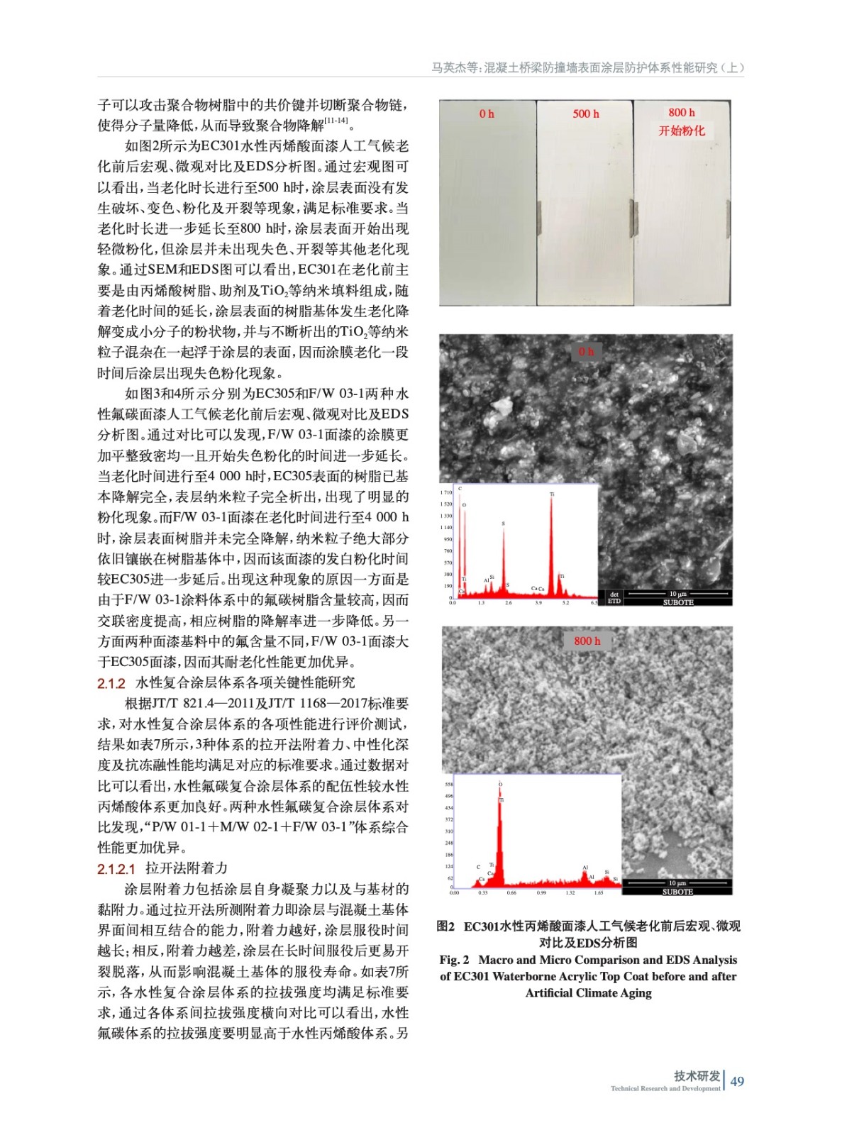 摘要:針對混凝土橋梁防撞墻極易受外界復雜腐蝕環境影響并造成嚴重損傷問題,本研究以“底漆+中間漆+面漆”的復合涂層體系作為設計方案,分別采用3種水性和3種高固體分溶劑型混凝土表面復合防護涂層體系,根據相應標準分別對它們進行了系統性評價研究。