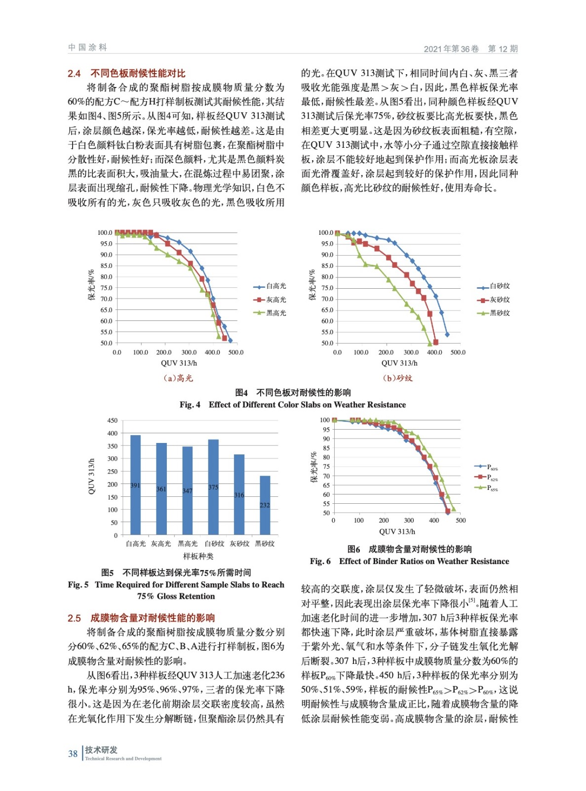摘要:研究了不同間苯二甲酸/對苯二甲酸(IPA/TPA)質(zhì)量比、己二酸(ADA)用量、多元醇對聚酯樹脂性能的影響,確定了最佳聚酯樹脂合成配方,并研究了顏料、表面和成膜物含量對聚酯樹脂粉末涂料性能的影響。結(jié)果表明:制備的聚酯樹脂具有優(yōu)異的耐候性和良好的機(jī)械性能。