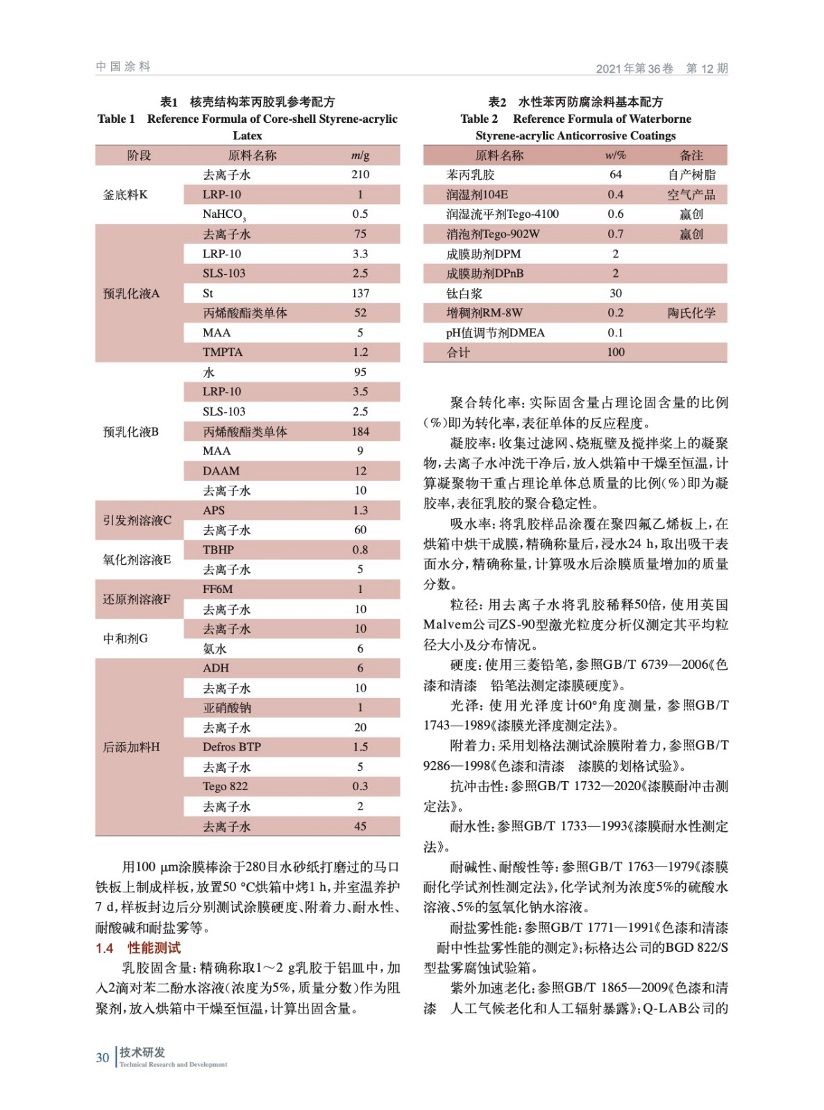 摘要:探究了不同的乳液聚合方法和工藝、叔碳酸乙烯酯(VeoVa10)加入方式及其添加量對乳膠的單體轉化率、聚合凝膠率、氣味、吸水率、耐水性和耐堿性等性能的影響,并通過粒徑測試對乳膠粒子核殼結構進行了分析,還討論了所合成的VeoVa10改性苯丙乳膠的防腐機理。結果表明,用制備的水性單組分工業防腐涂料,不僅成本優勢明顯,且具有優良的附著力、硬度、抗沖擊性能,以及耐水、耐酸堿、耐鹽霧和耐候性能。