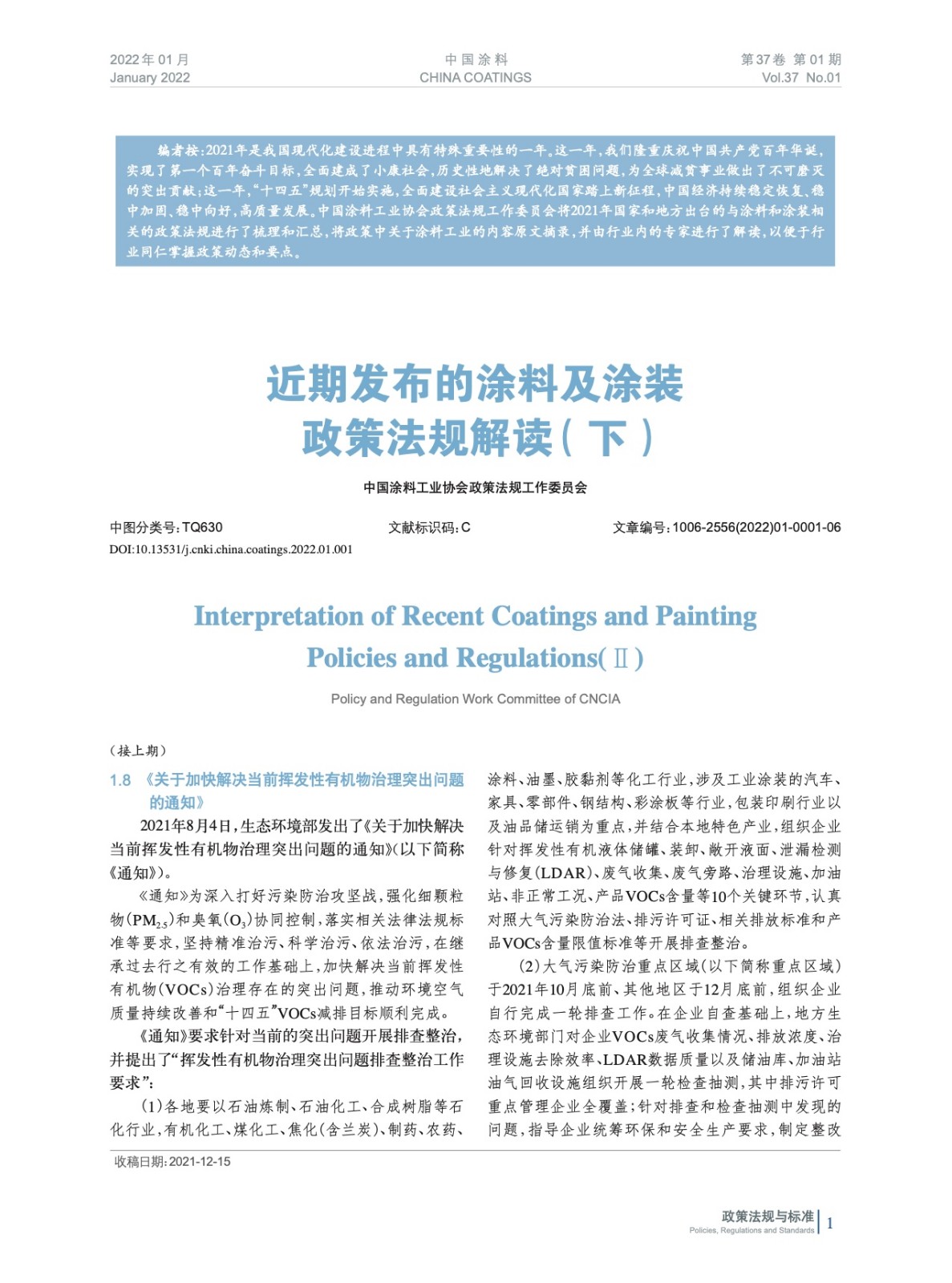 摘要:編者按:中國涂料工業(yè)協(xié)會(huì)政策法規(guī)工作委員會(huì)將2021年國家和地方出臺(tái)的與涂料和涂裝相關(guān)的政策法規(guī)進(jìn)行了梳理和匯總,將政策中關(guān)于涂料工業(yè)的內(nèi)容原文摘錄,并由行業(yè)內(nèi)的專家進(jìn)行了解讀,以便于行業(yè)同仁掌握政策動(dòng)態(tài)和要點(diǎn)。