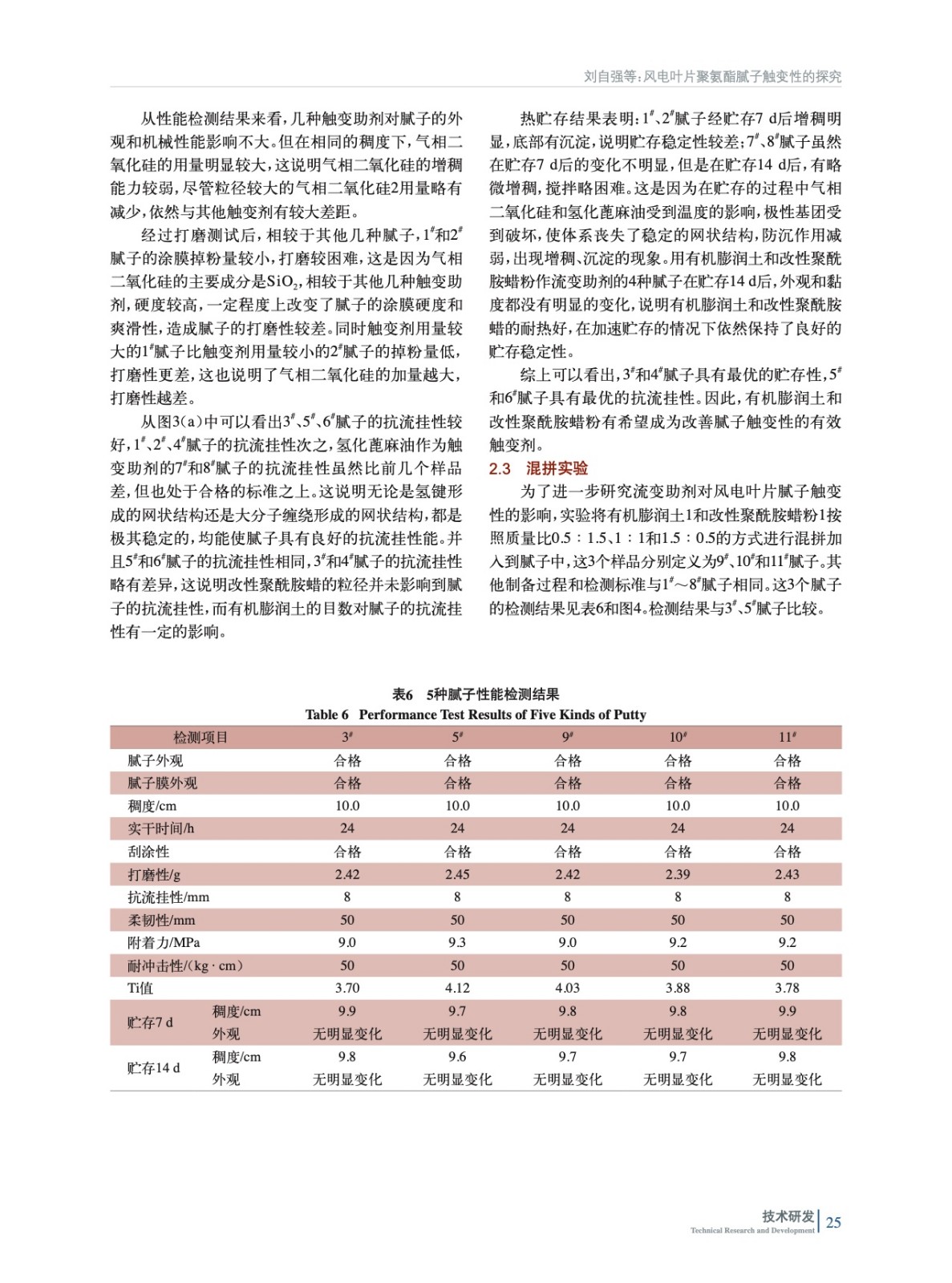 摘要:實(shí)驗(yàn)通過多個(gè)角度對(duì)風(fēng)電葉片膩?zhàn)拥挠|變性進(jìn)行了探究。測(cè)試結(jié)果表明,觸變助劑對(duì)膩?zhàn)拥臋C(jī)械性能幾乎無影響,通過有機(jī)膨潤(rùn)土和改性聚酰胺蠟粉的合理搭配使用,既能讓風(fēng)電葉片聚氨酯膩?zhàn)泳哂袃?yōu)良的貯存穩(wěn)定性,又使其有好的抗流掛性和刮涂性。