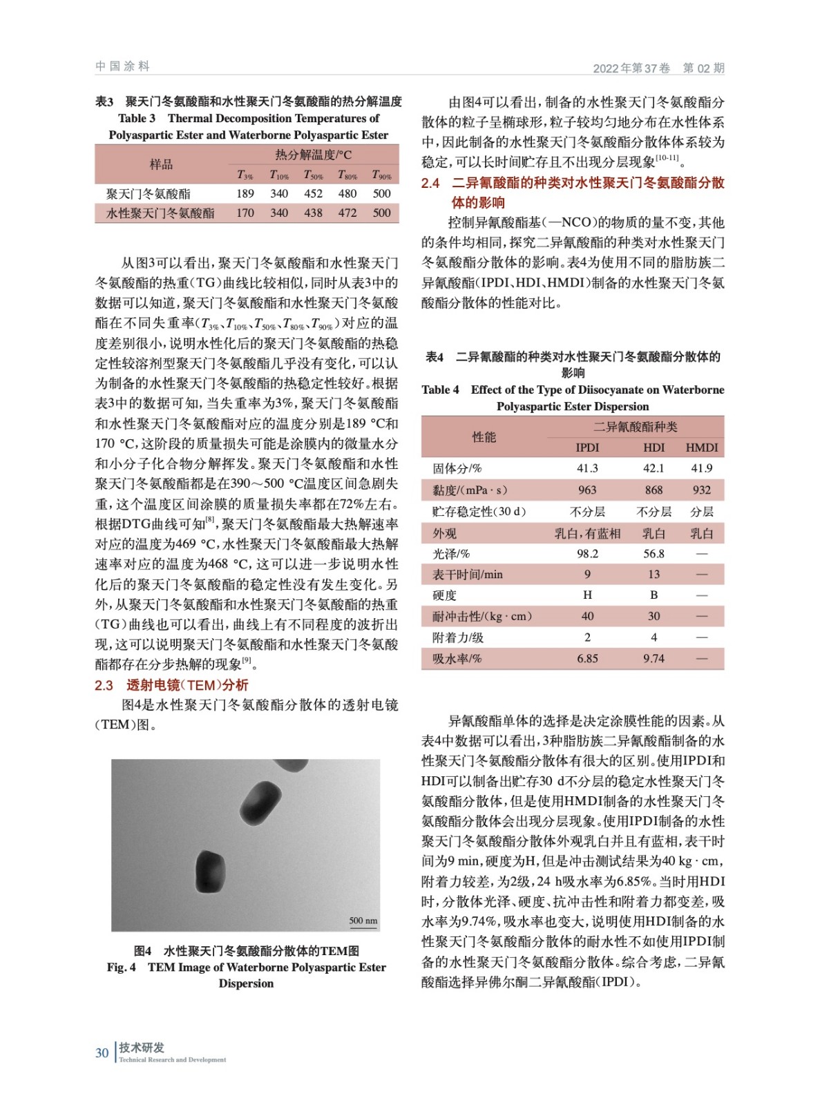 摘要:以聚天門冬氨酸酯樹脂、聚醚胺及二異氰酸酯為原料制備了水性聚天門冬氨酸酯分散體。使用紅外光譜、熱重分析、透射電鏡和激光粒度分析儀對樣品進行表征測試,結果表明:當二異氰酸酯選擇IPDI、n(聚天門冬氨酸酯F420)/n(聚天門冬氨酸酯F520)為4時,水性聚天門冬氨酸酯分散體狀態穩定,涂膜性能最好。