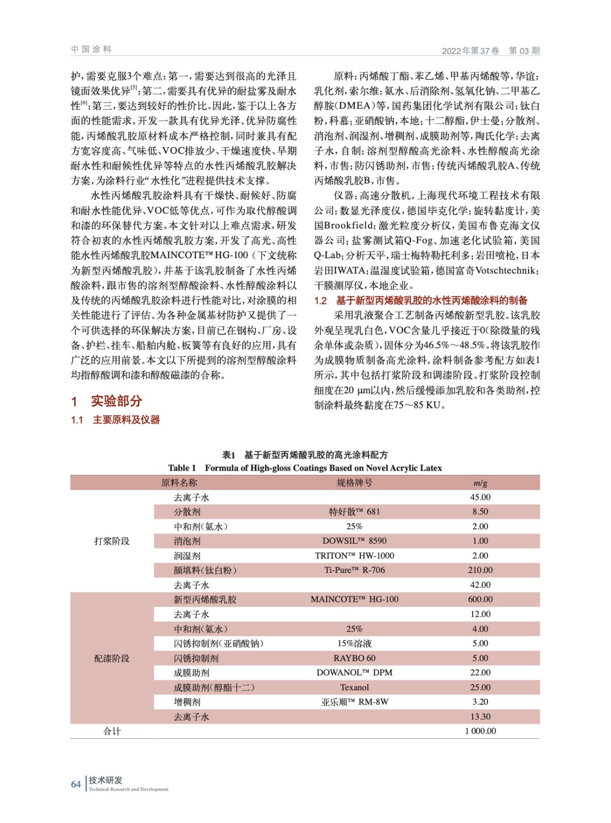 摘要:實(shí)驗(yàn)針對(duì)性地開發(fā)了一款水性高光高性能新型丙烯酸乳膠,并以此為成膜物質(zhì),輔以合適的顏填料和助劑,制備出了具有優(yōu)異光澤展現(xiàn)力的單組分水性丙烯酸涂料。相較于溶劑型醇酸涂料,該涂料具有良好的光澤和耐鹽霧性能,同時(shí)提供更快的干燥速度、更低的氣味和VOC釋放、更優(yōu)的耐候性,適用于各種金屬基材防護(hù)應(yīng)用,如鋼構(gòu)、廠房、設(shè)備、護(hù)欄、掛車、船舶內(nèi)艙、板簧等,具有廣泛的應(yīng)用領(lǐng)域和市場前景。