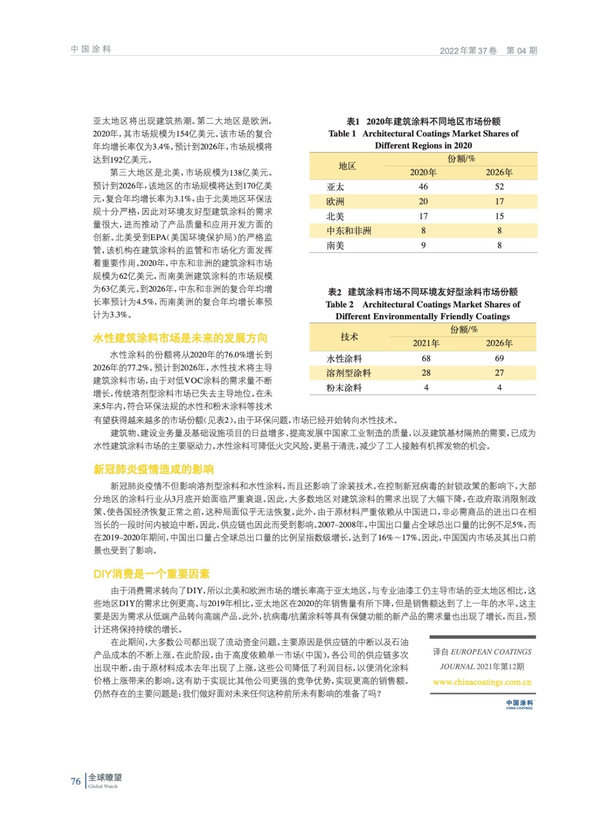 摘要:編者按:在2020年疫情封鎖期間,對重涂的需求不高和時間上的不允許,使建筑涂料需求的增長轉(zhuǎn)向DIY領(lǐng)域。各公司也都將重點轉(zhuǎn)向提供適應趨勢變化的產(chǎn)品,以促進銷售。據(jù)估計,2020年全球建筑涂料的市場規(guī)模約為663億美元,預計到2026年將達到916億美元,復合年均增長率為5.1%。