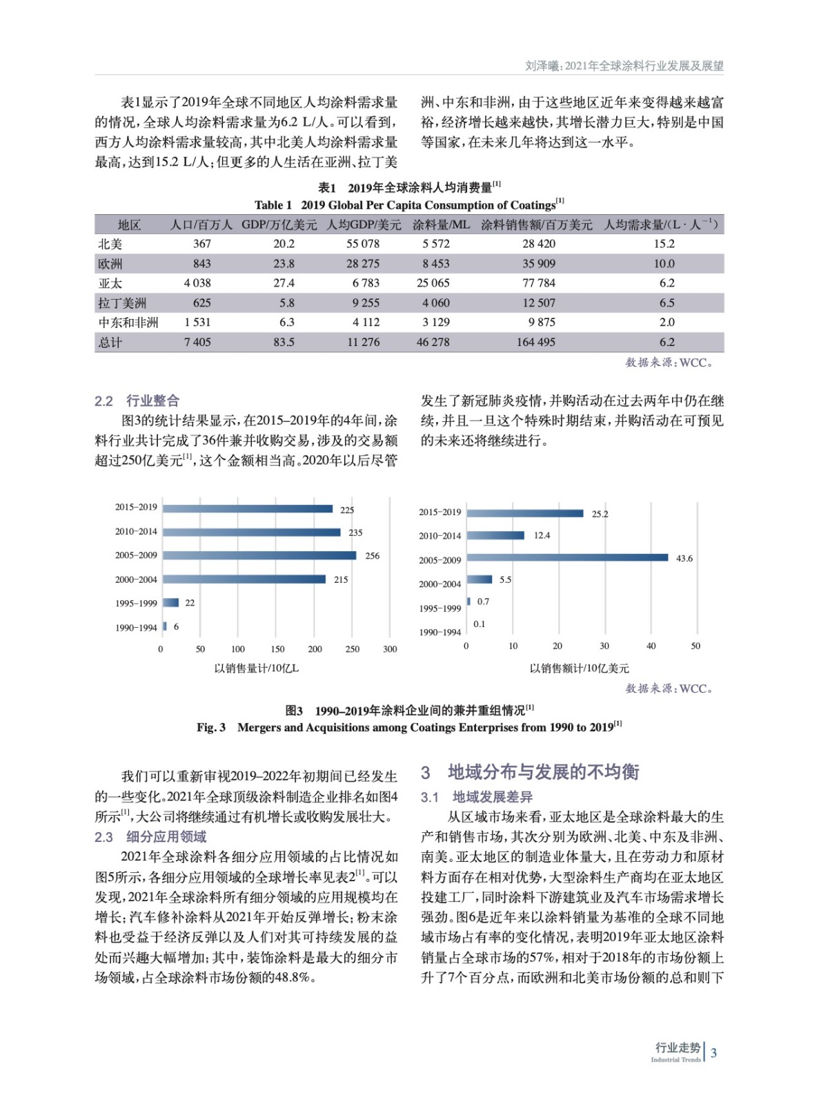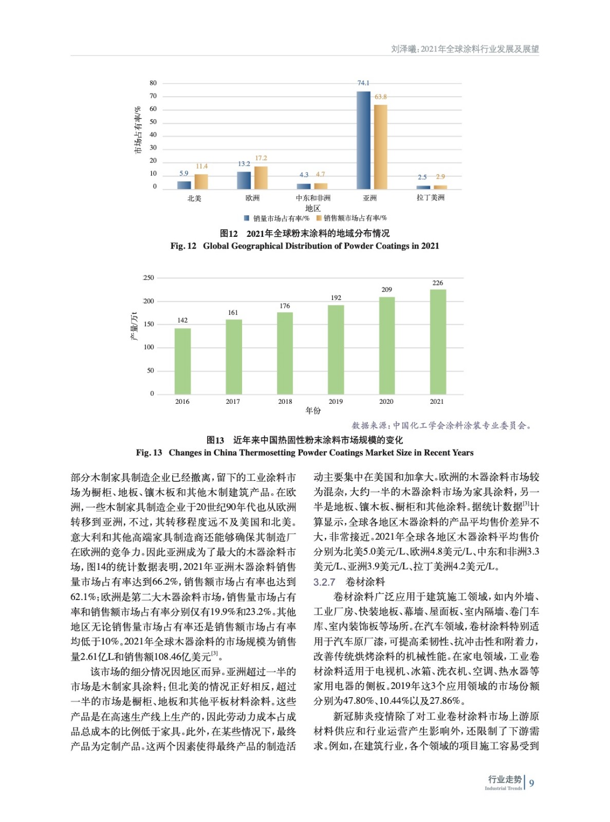 摘要:2021年在全球經(jīng)濟逐漸復蘇的大背景下,全球涂料行業(yè)呈現(xiàn)積極的增長態(tài)勢,亞洲成為全球涂料行業(yè)增長最快的地區(qū)。在粉末涂料、汽車涂料、軌道交通涂料、工業(yè)涂料等多個細分涂料領域,中國涂料行業(yè)的表現(xiàn)最為亮眼。詳細分析了2021年全球涂料市場規(guī)模、地域分布、細分市場,以及各地區(qū)細分市場的差異和發(fā)展的不均衡性,指出未來幾年亞洲仍然是全球涂料行業(yè)增長最快的地區(qū)。