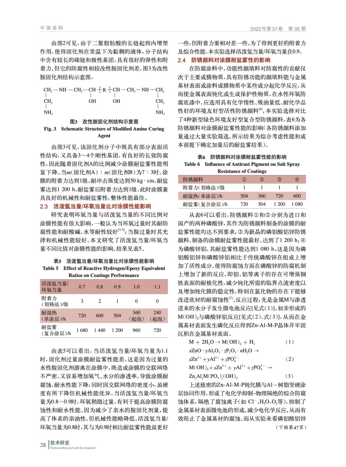 摘要:以小粒徑環(huán)氧樹(shù)脂乳液搭配改性胺和聚酰胺復(fù)配固化劑為主要成膜物,選用磷鉬酸鋁鋅為防銹顏料制備了符合環(huán)保要求并滿(mǎn)足軌道車(chē)輛內(nèi)飾表面涂裝要求的水性環(huán)氧涂料。考察結(jié)果表明:活潑氫當(dāng)量與環(huán)氧當(dāng)量比選擇0.9,并且搭配磷鉬酸鋁鋅作為防銹顏料制備的涂料滿(mǎn)足要求,適用于較難附著的不銹鋼、鋁合金等多種金屬基材的防腐保護(hù)。