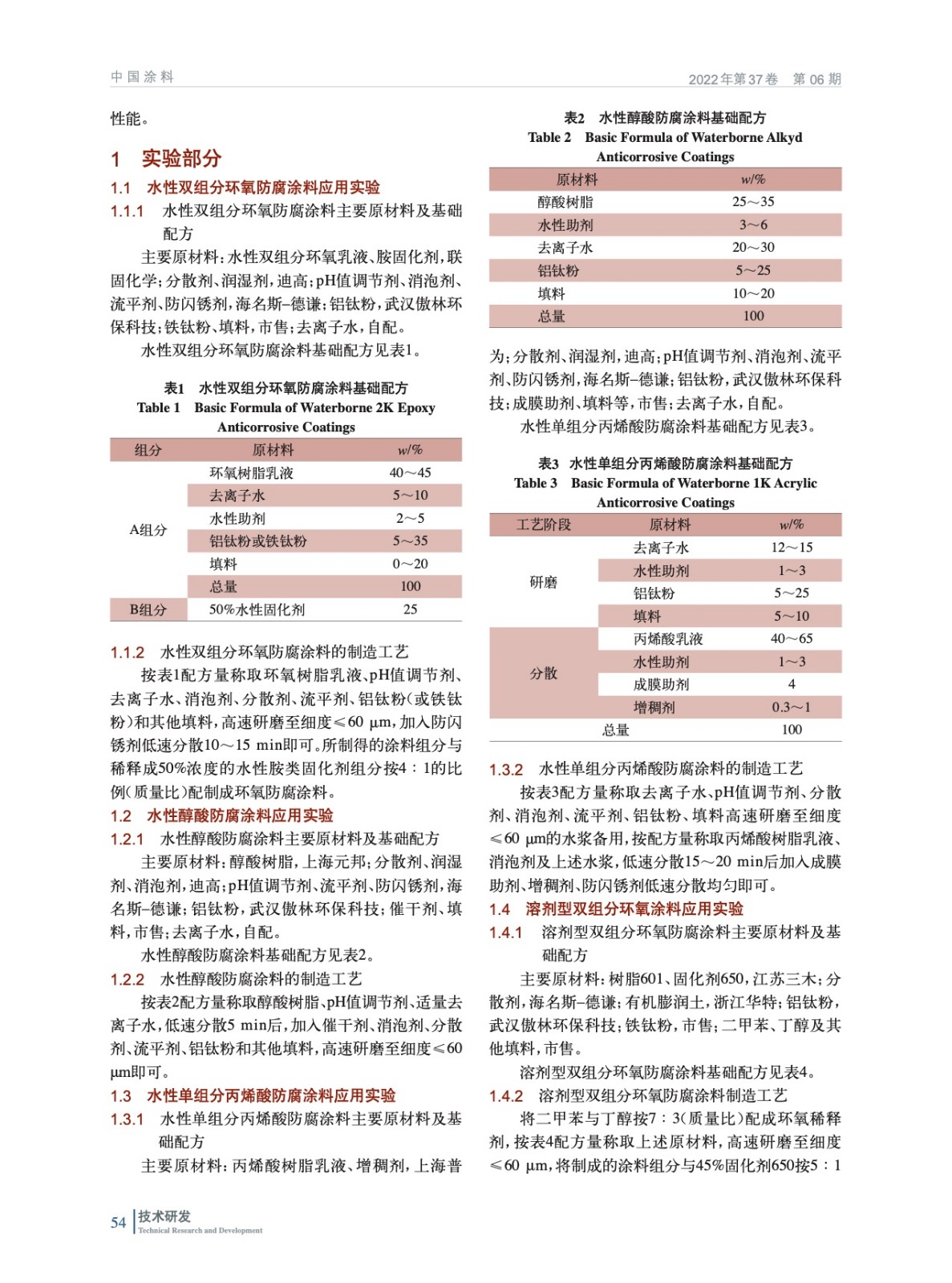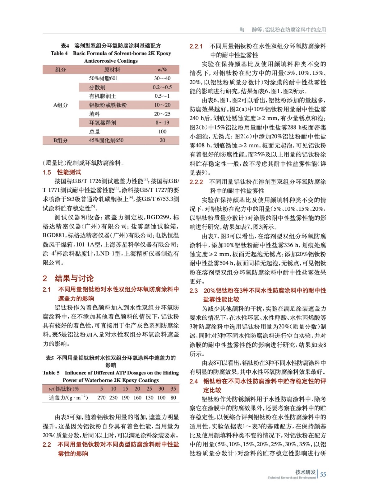 摘要:通過對鋁鈦粉在各類防腐涂料中的應(yīng)用實驗,結(jié)果表明鋁鈦粉具有良好的防腐性能,其用量在20%時,涂料綜合性能良好,水性雙組分環(huán)氧防腐涂料可耐中性鹽霧408 h,水性醇酸防腐涂料可耐中性鹽霧168 h,水性單組分丙烯酸防腐涂料中達(dá)216 h,溶劑型雙組分環(huán)氧防腐涂料中達(dá)500 h。且通過鋁鈦粉和鐵鈦粉的雙組分環(huán)氧防腐涂料耐中性鹽霧性能對比實驗,結(jié)果表明鋁鈦粉的防腐性更優(yōu)。