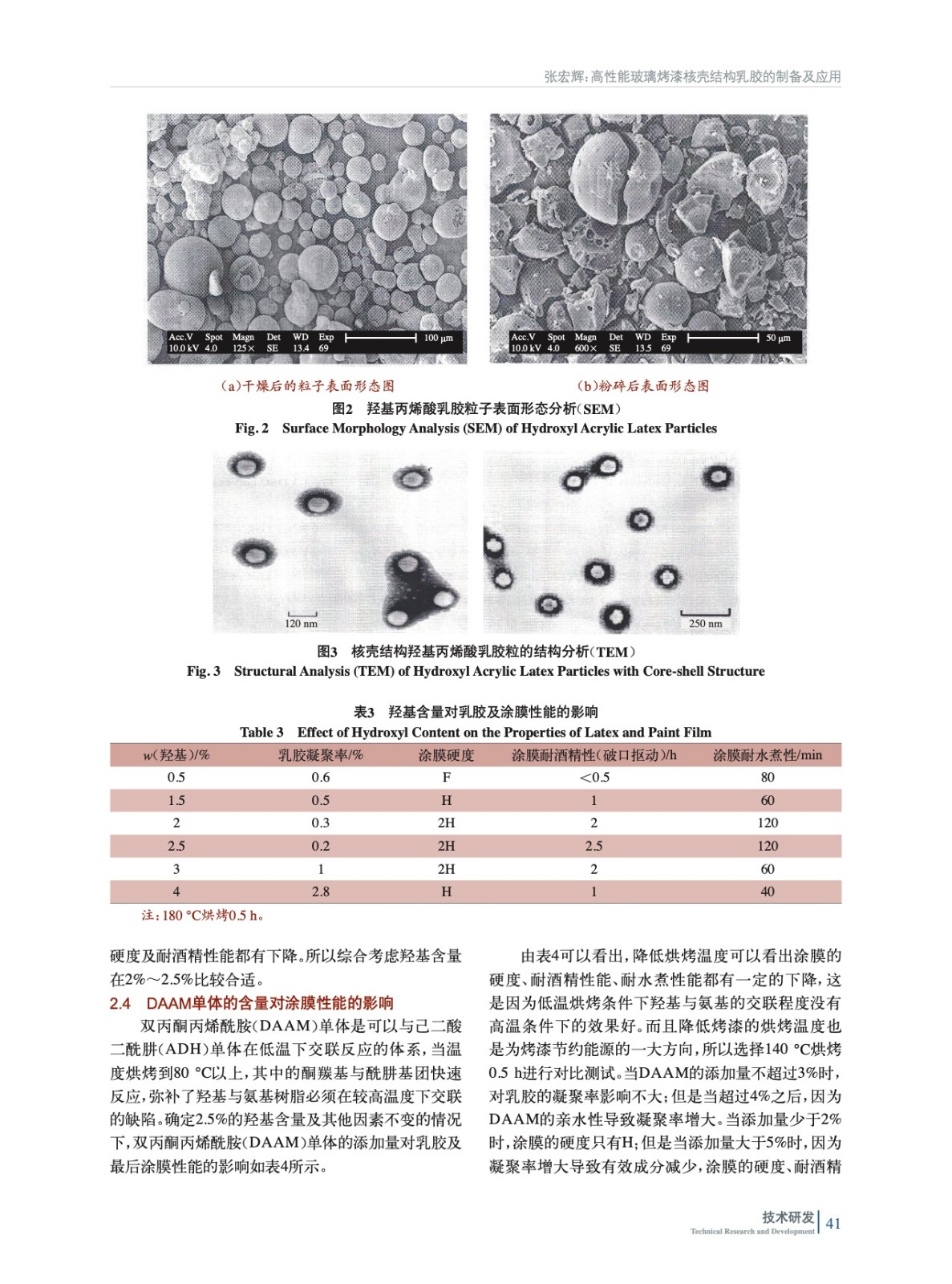 摘要:以甲基丙烯酸甲酯、甲基丙烯酸環己酯、苯乙烯、丙烯酸丁酯為基本單體,以丙烯酸、甲基丙烯酸羥乙酯、雙丙酮丙烯酰胺等為親水性功能單體,搭配過硫酸胺為引發劑,采用預乳化半連續滴加工藝,通過乳液聚合反應制得DAAM改性的羥基丙烯酸乳膠。該乳膠粒子粒徑大小均勻,呈現規則的球型狀態。經過添加紅色漿調漆后,所得水性玻璃烤漆在120~180 ℃烘烤0.5 h,并優化配方得到性能優異的玻璃烤漆。