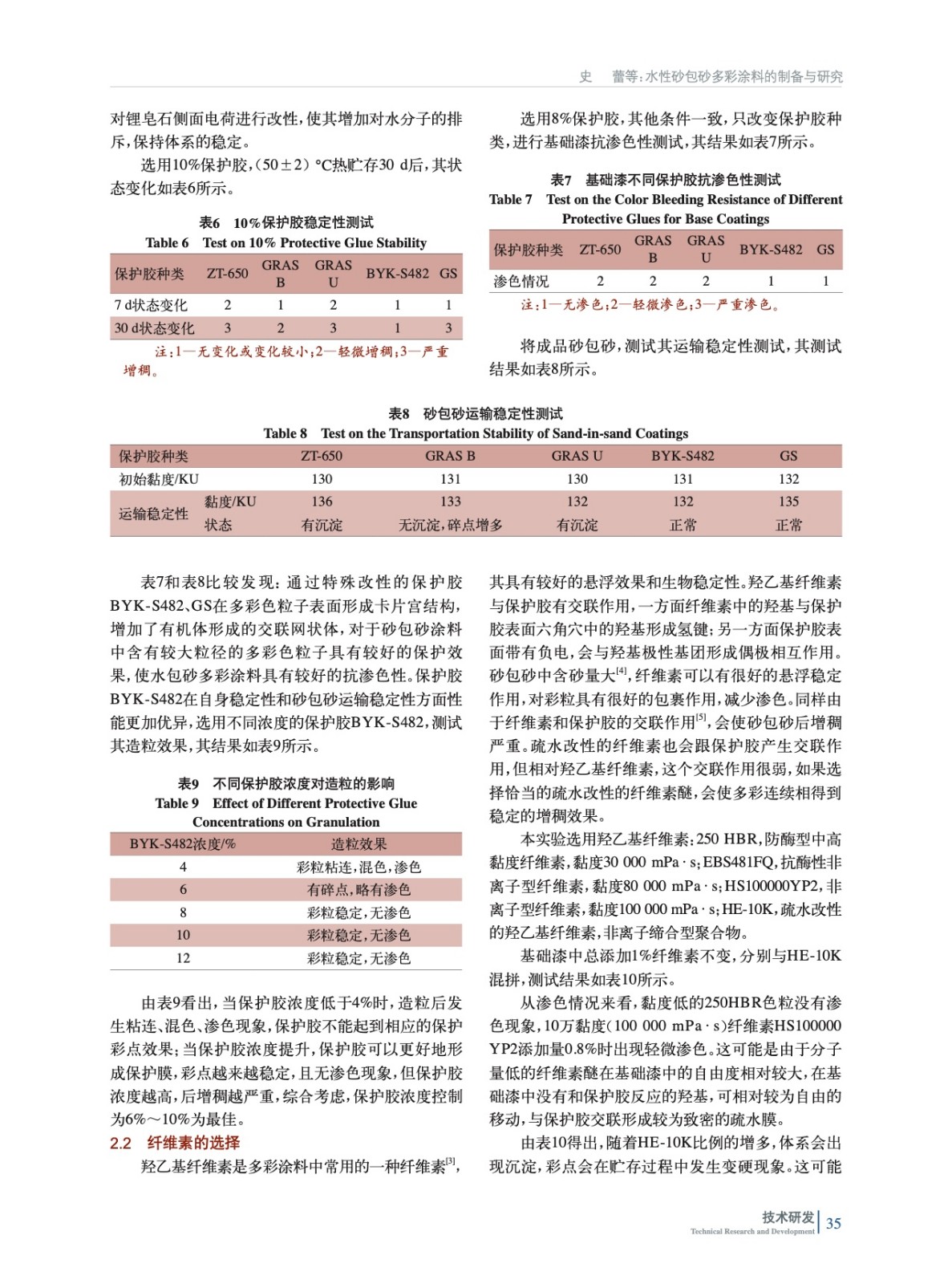 介紹了一種可以與真石漆相媲美的砂包砂涂料的制備,從保護膠、纖維素、乳膠方面平行實驗對比,最終確定了其最佳添加量。實驗結果表明,該砂包砂涂料,體系穩定,耐水白性優異,抗滲色性好,耐候性佳,施工美觀,凹凸感強,且較真石漆耗量少,價格低,前景可觀。