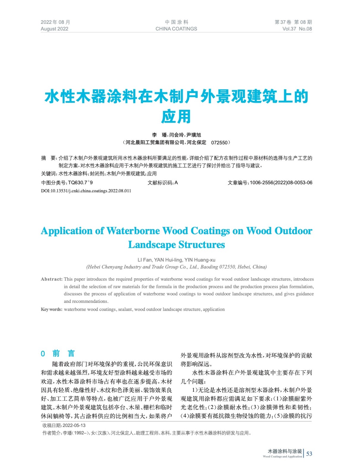 介紹了木制戶外景觀建筑所用水性木器涂料所要滿足的性能,詳細介紹了配方在制作過程中原材料的選擇與生產工藝的制定方案,對水性木器涂料應用于木制戶外景觀建筑的施工工藝進行了探討并給出了指導與建議。