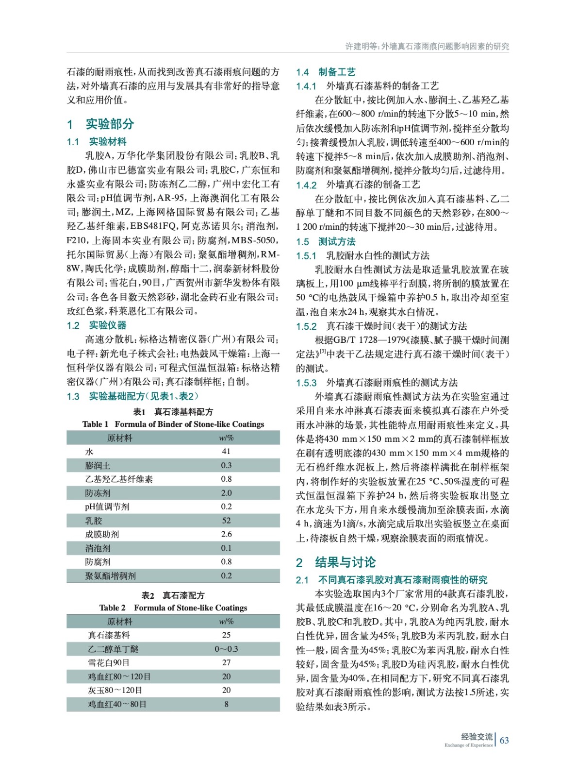 討論了不同真石漆乳膠品種、乳膠用量、成膜條件和彩砂用量對真石漆雨痕的影響,并研究了在真石漆中添加乙二醇單丁醚對真石漆雨痕的影響。