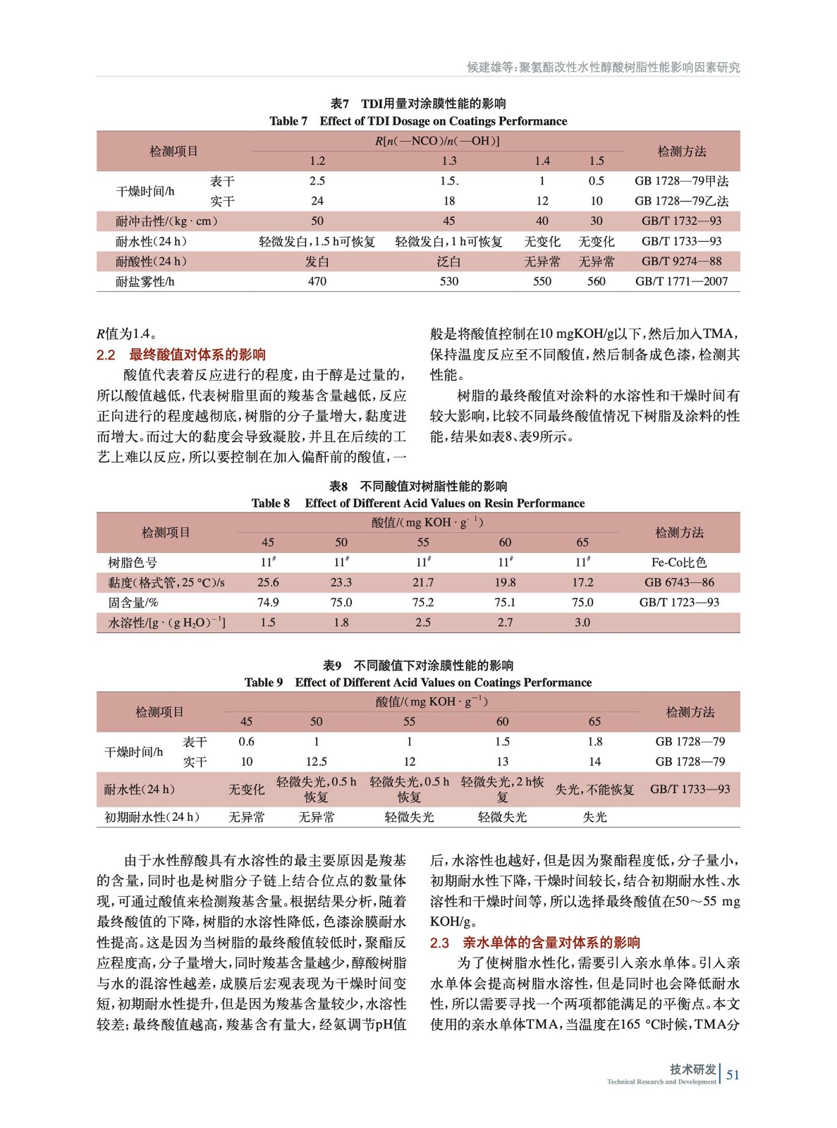 討論了R值[n(—NCO)/n(—OH)]、最終酸值和親水單體的用量3種因素對水性醇酸樹脂性能的影響。通過優選,最終獲得了性價比、環境友好性能均佳的樹脂,并制備了符合標準和滿足客戶流水線需求的色漆產品。