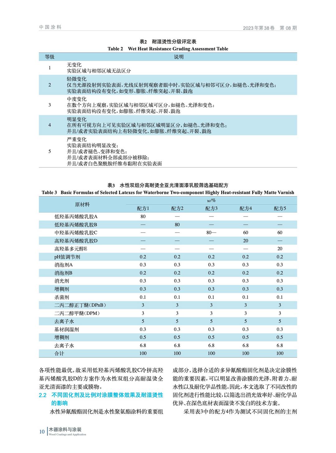 通過對乳膠、水性固化劑、消光材料、成膜助劑的篩選、配方優化調整,制備出一款應用于高檔(酒店、辦公)家具上各項性能優異的水性雙組分高耐燙全亞光清面漆,并對影響因素進行了研究。