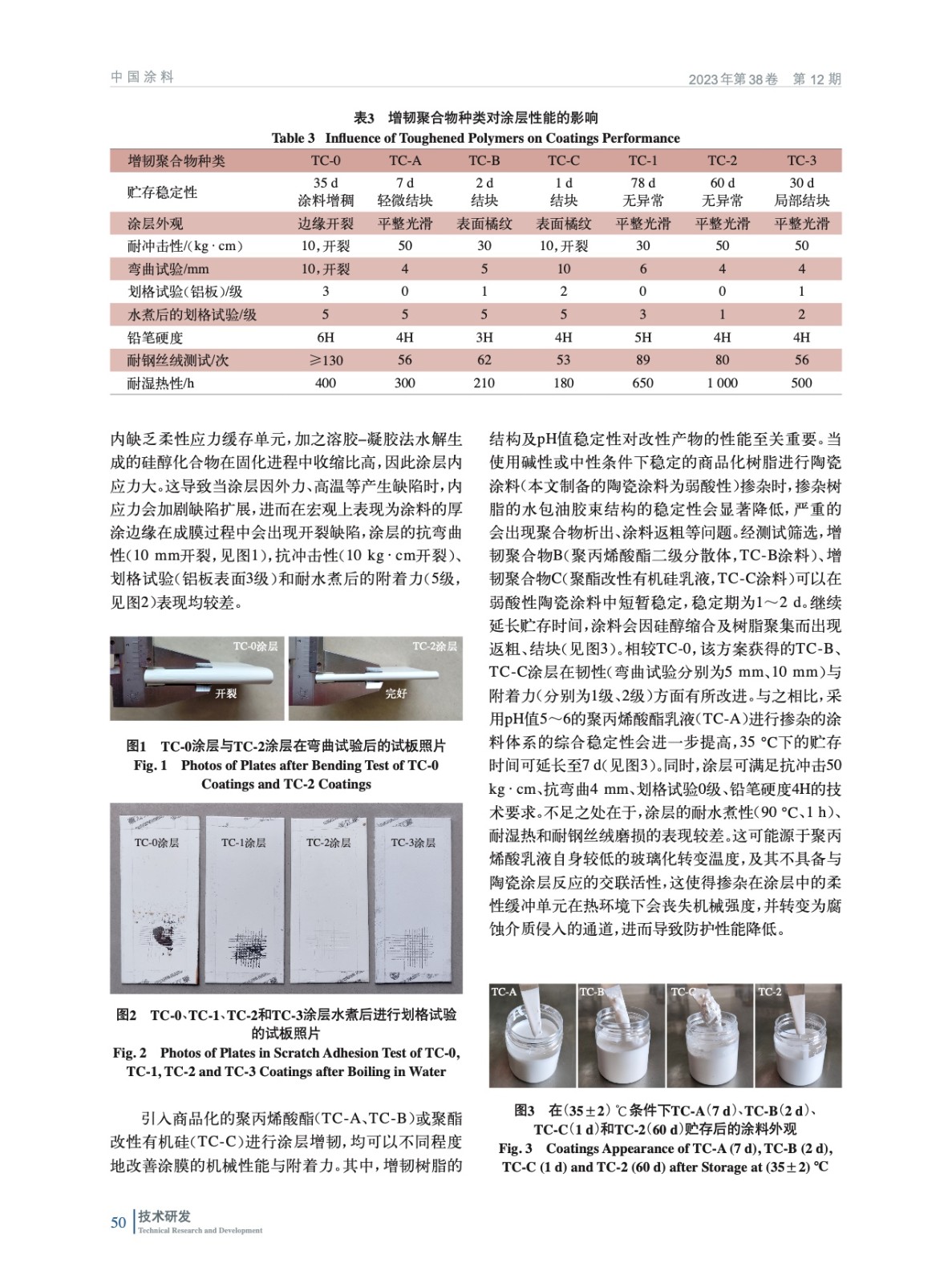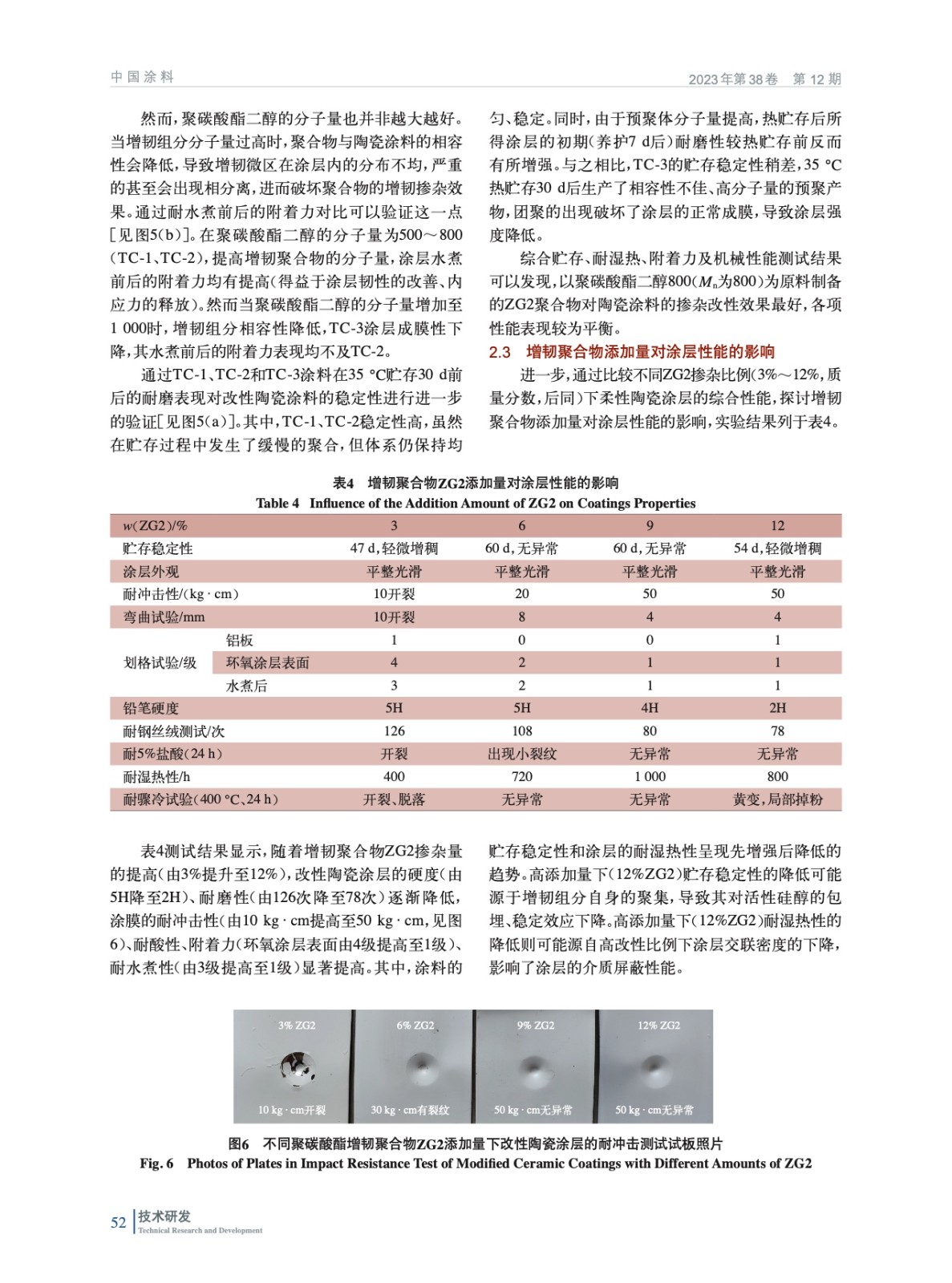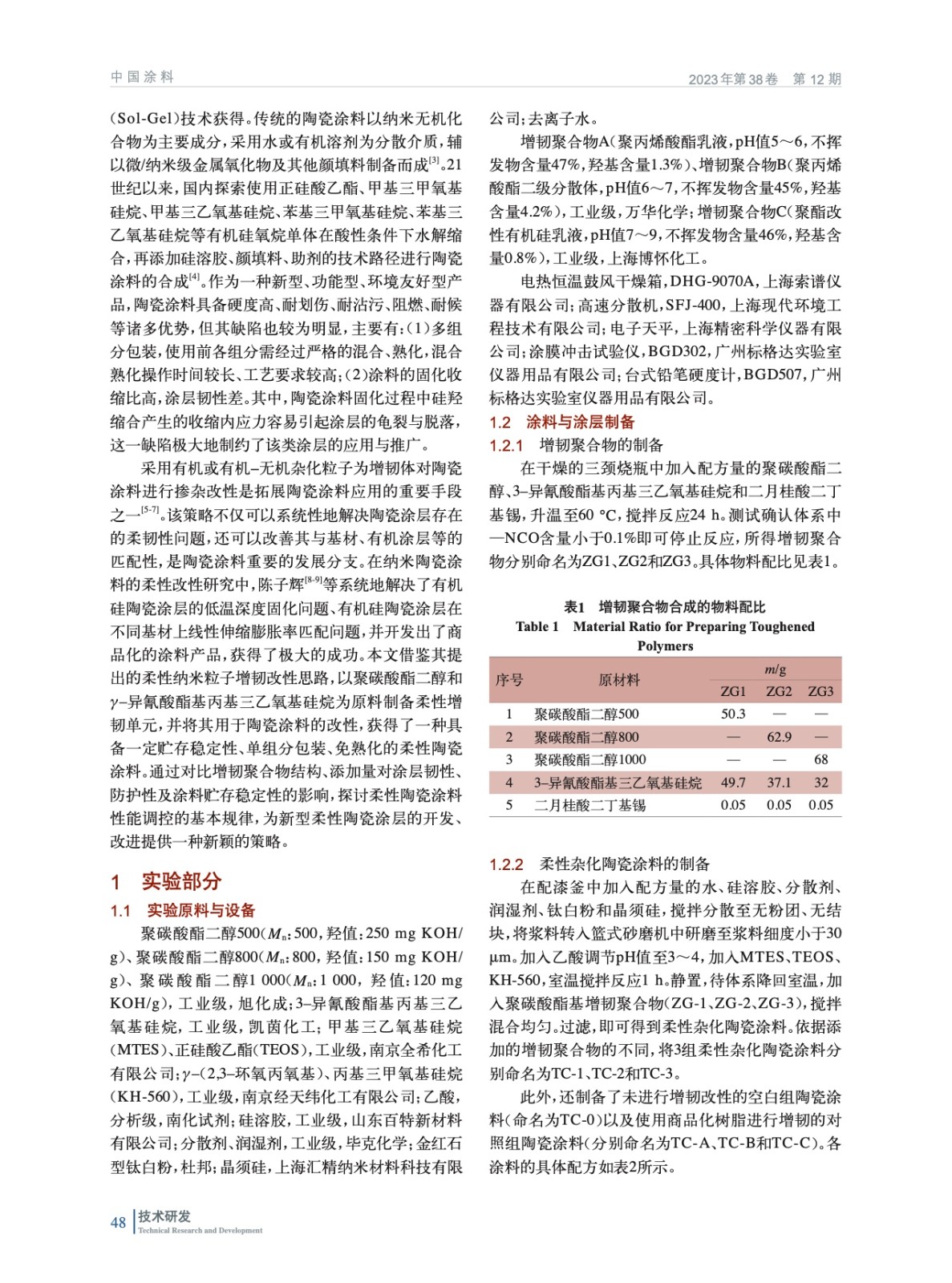 摘要:以聚碳酸酯二醇和γ–異氰酸酯基丙基三乙氧基硅烷為原料,制備了具有良好硅烷相容性與貯存穩(wěn)定性的活性增韌聚合物ZG2,并將其應(yīng)用于陶瓷涂料的柔性改性。實(shí)驗(yàn)結(jié)果顯示,聚碳酸酯基增韌聚合物ZG2的摻雜,一方面可以包埋涂料中的活性硅醇,延長涂料的貯存周期;另一方面可以充當(dāng)涂層中的柔性緩沖區(qū),改善因收縮應(yīng)力而產(chǎn)生的涂層開裂、附著力低等問題。此外,ZG2還可以參與陶瓷涂料的交聯(lián)進(jìn)程,提升涂層的腐蝕介質(zhì)屏蔽性。當(dāng)ZG2的摻雜質(zhì)量分?jǐn)?shù)為9%時,所得改性雜化陶瓷涂料的貯存穩(wěn)定性、熱穩(wěn)定性、機(jī)械強(qiáng)度及綜合防護(hù)性能最優(yōu),具備市場化推廣潛力。