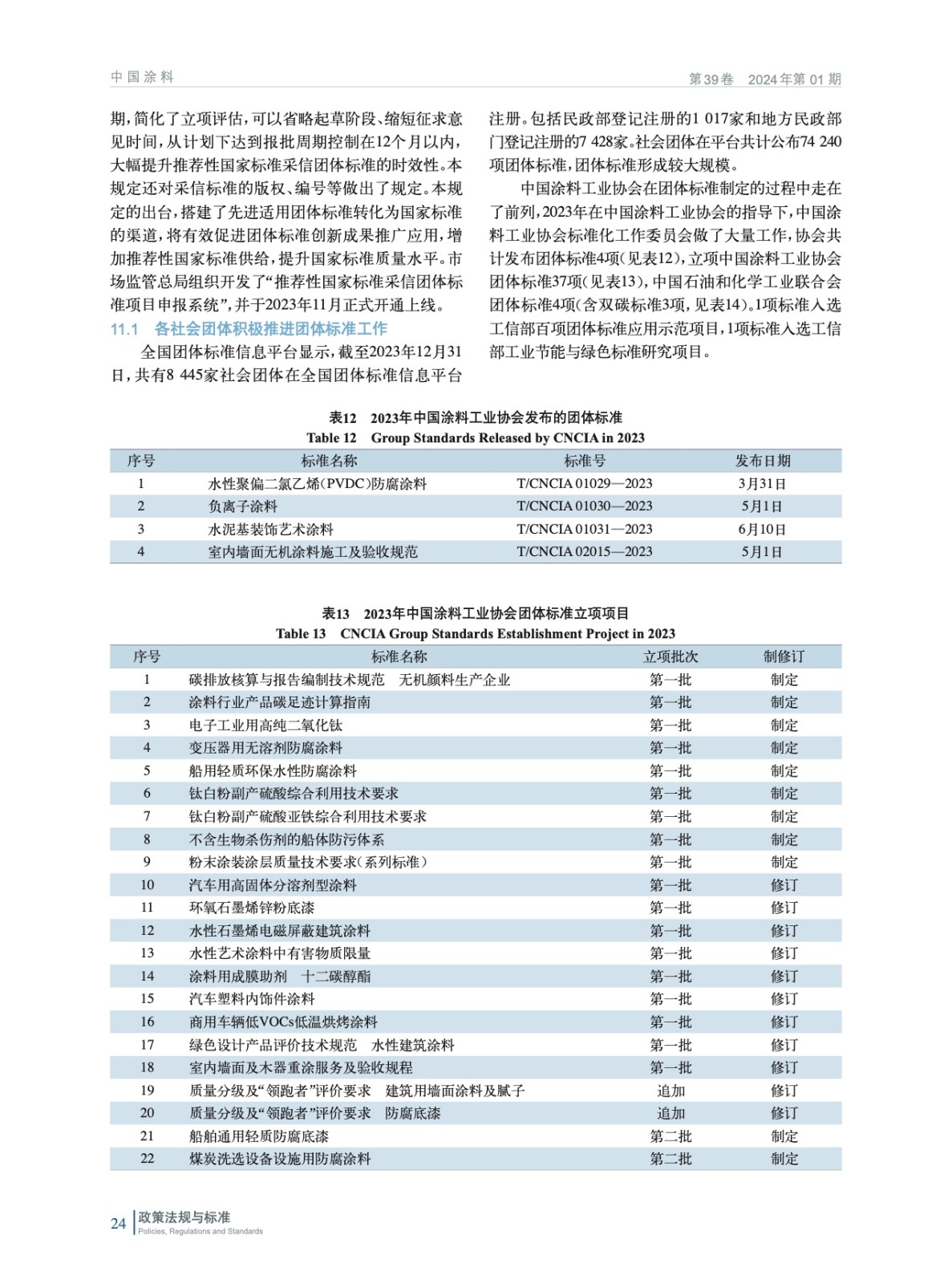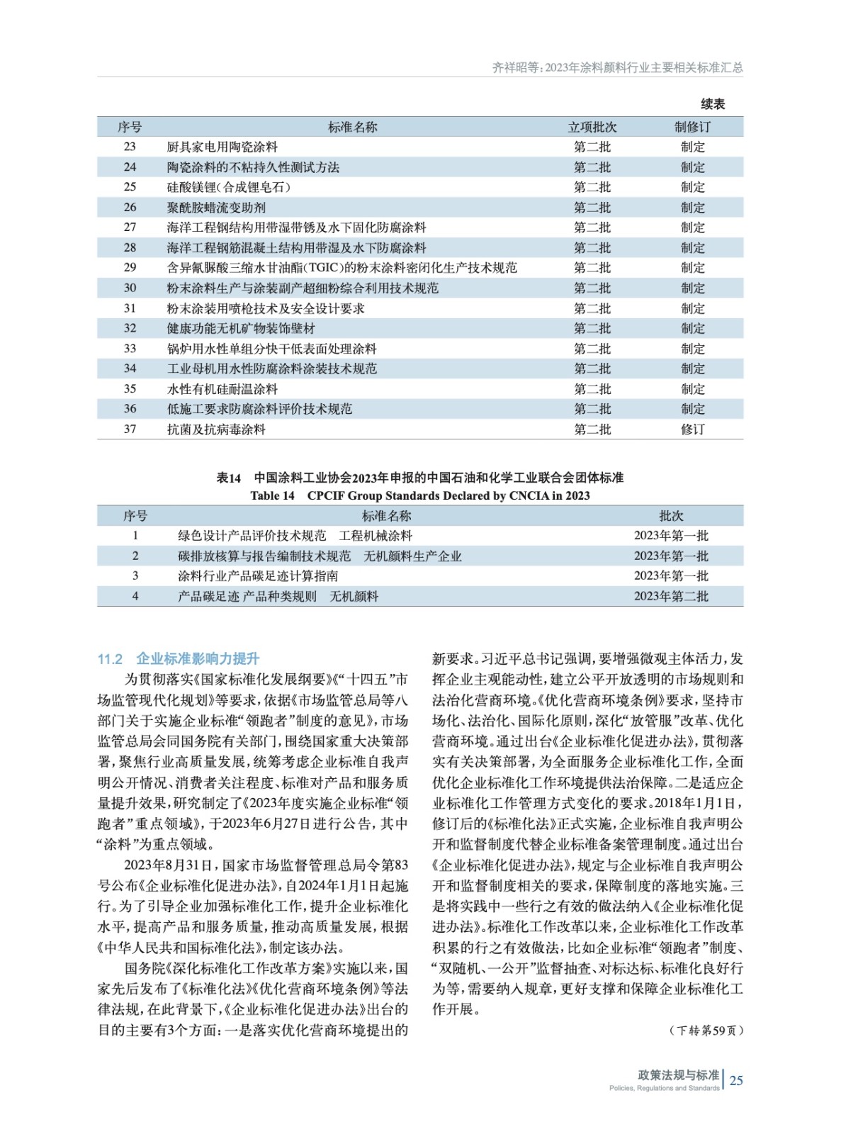 摘要:2023年,涂料、顏料相關(guān)標準得以進一步完善。國家標準年度復審工作有序進行,推進標準更新升級;標準體系進一步優(yōu)化,持續(xù)提高標準質(zhì)量水平;持續(xù)完善國家標準樣品體系;推動推薦性國家標準采信團體標準,引領(lǐng)團體標準高水平供給,提高團體標準公信力。推動實施標準創(chuàng)新型企業(yè)梯度培育工作,積極培育標準創(chuàng)新型企業(yè);開展企業(yè)標準“領(lǐng)跑者”認證工作,引導企業(yè)爭創(chuàng)一批高質(zhì)量標準。