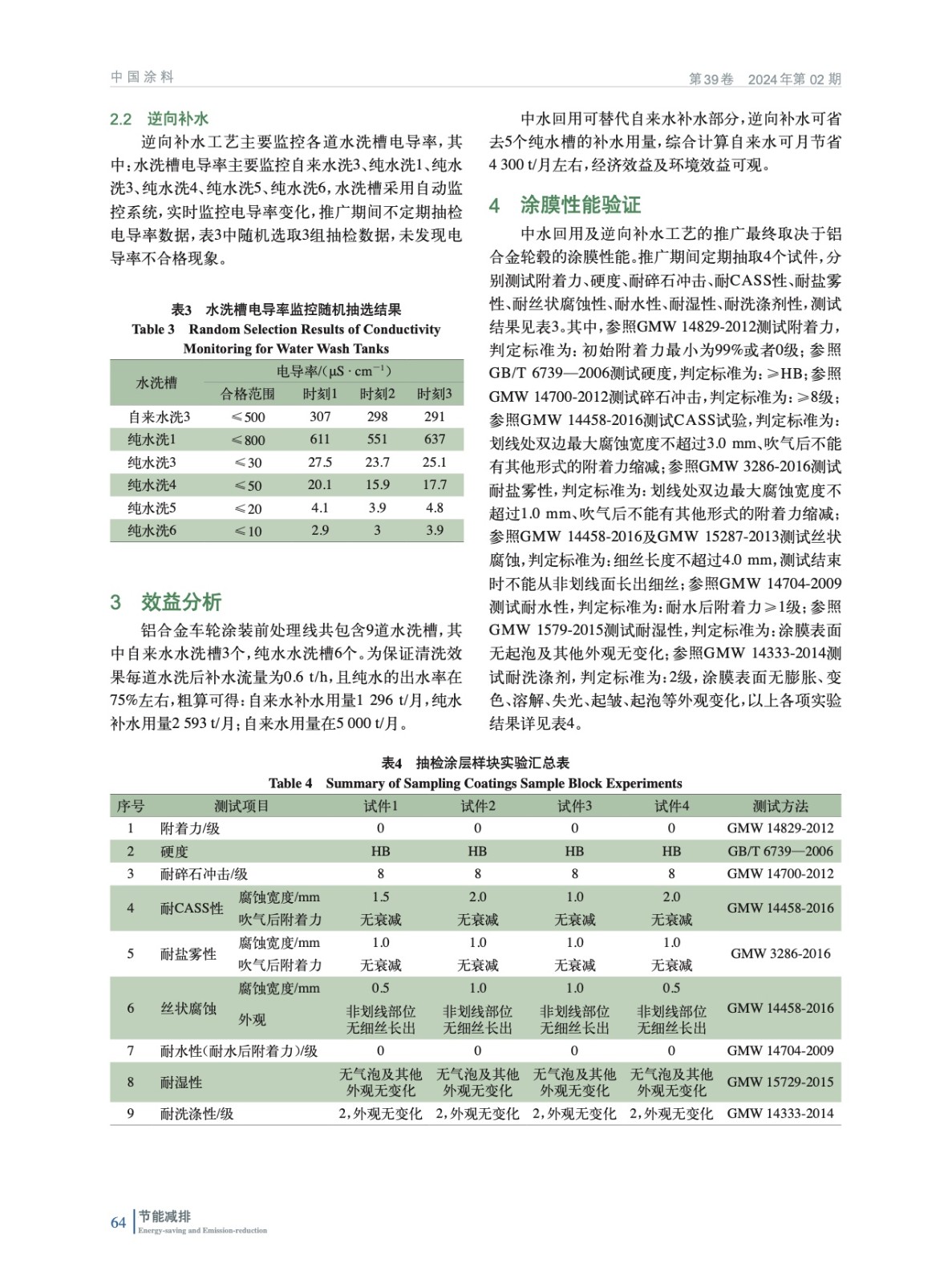 摘要:為提高水資源利用效率,達(dá)到節(jié)能降耗的目的,對鋁合金車輪前處理進(jìn)行中水回用及逆向補(bǔ)水可行性研究。優(yōu)化補(bǔ)水管路,嚴(yán)格監(jiān)控水洗槽電導(dǎo)率及末道水洗菌群污染程度;對鋁合金車輪涂膜性能(附著力、硬度、耐碎石沖擊、耐CASS試驗(yàn)、耐鹽霧性、耐絲狀腐蝕性、耐水性、耐濕性及耐洗滌劑)進(jìn)行測試。結(jié)果標(biāo)明:涂裝前處理中水回用及逆向補(bǔ)水工藝穩(wěn)定,水洗槽電導(dǎo)率及末道水洗含菌量均滿足前處理工藝指標(biāo)要求,涂膜性能合格。