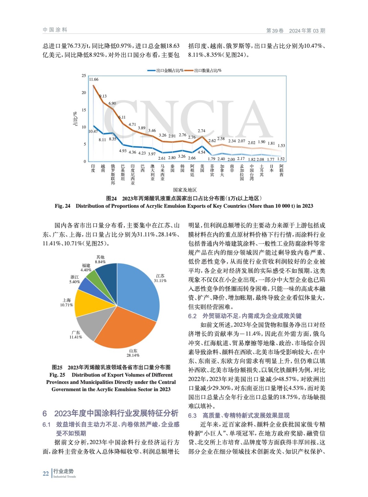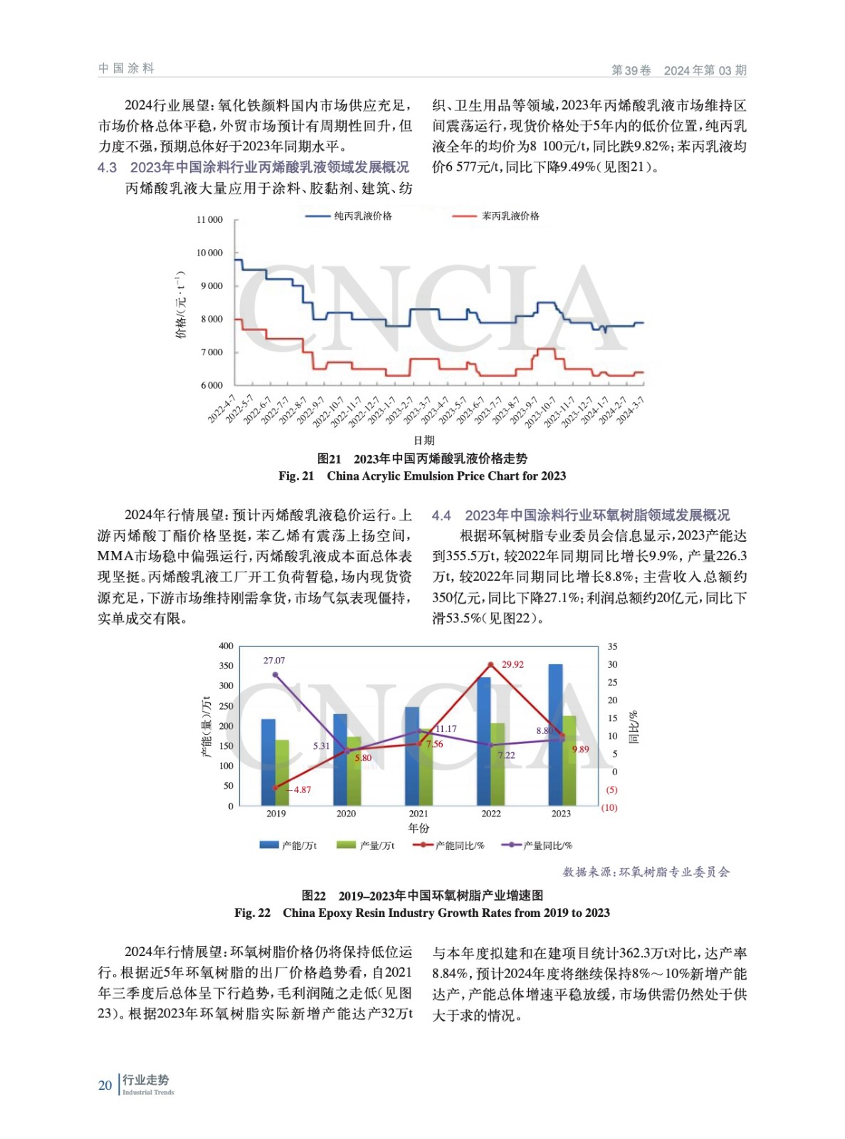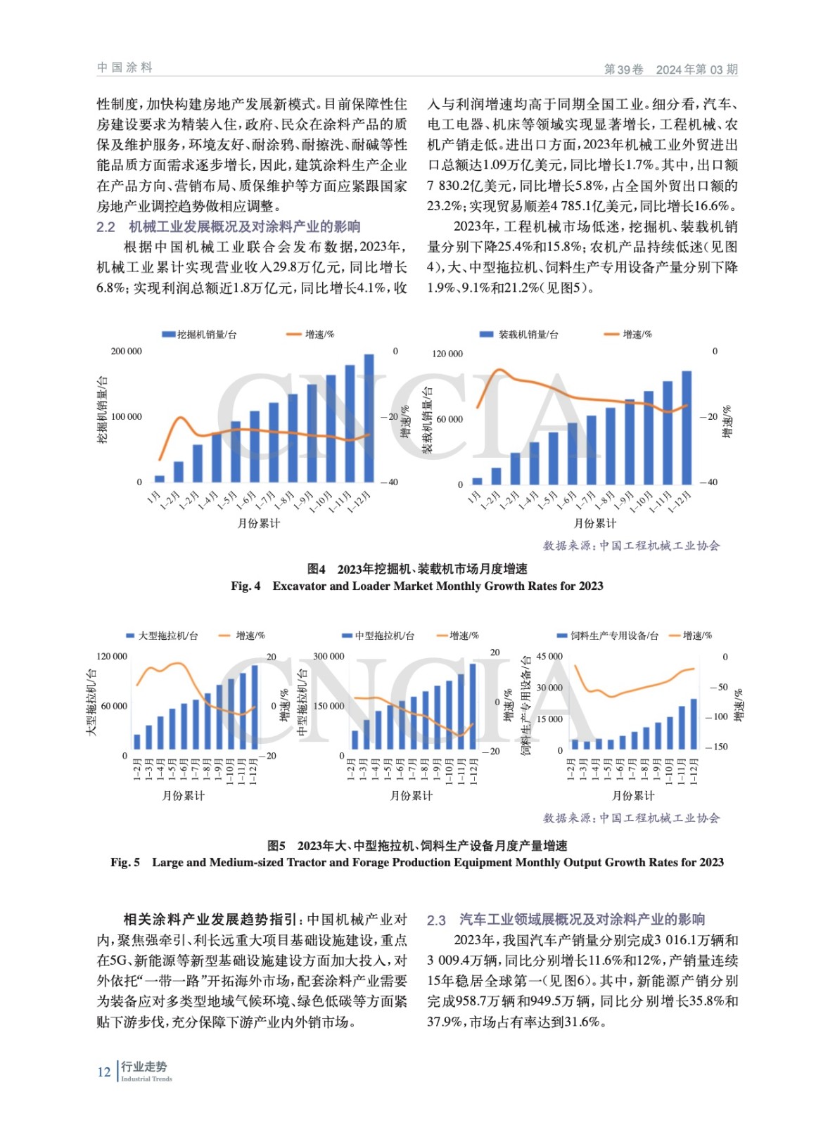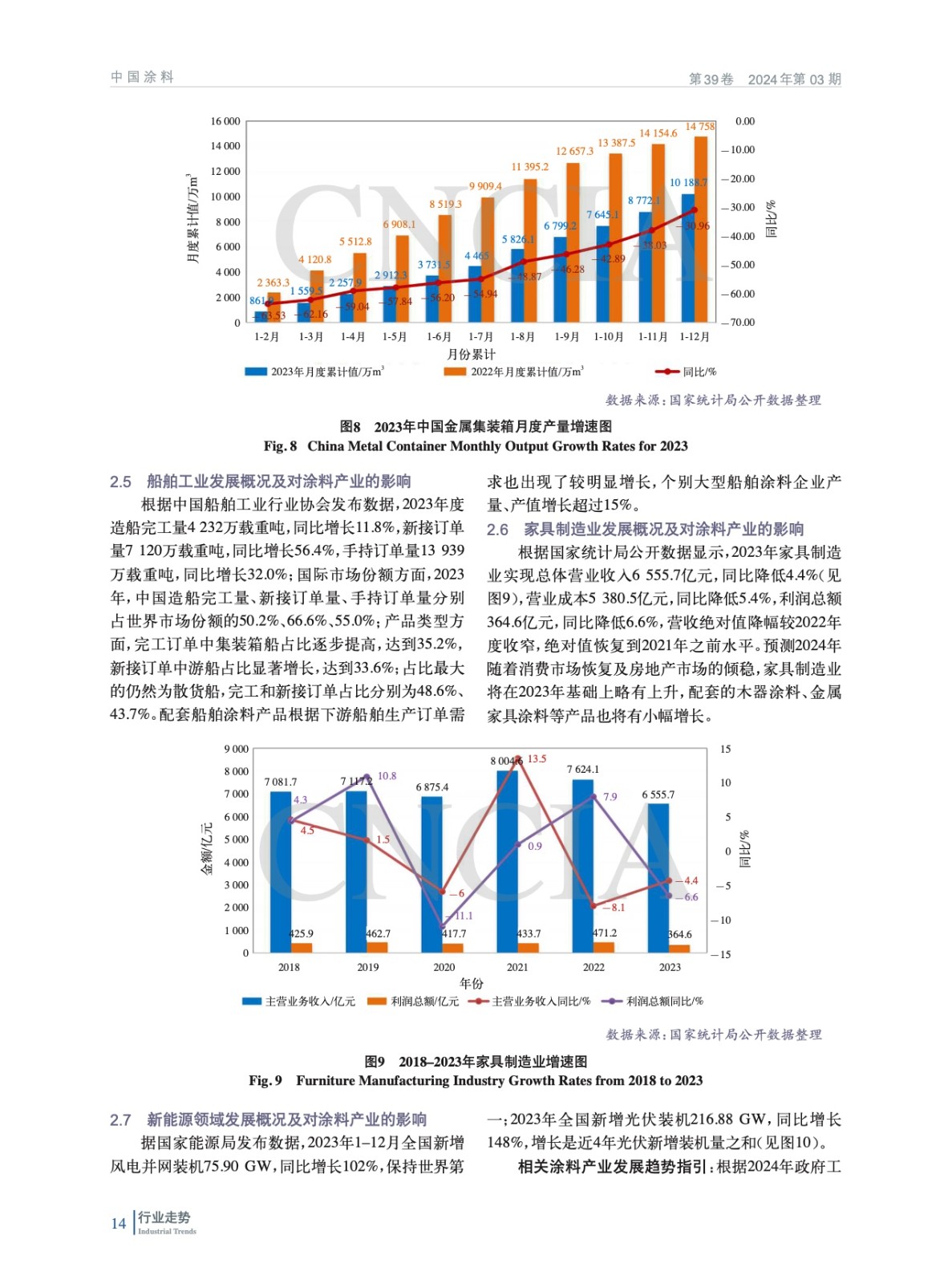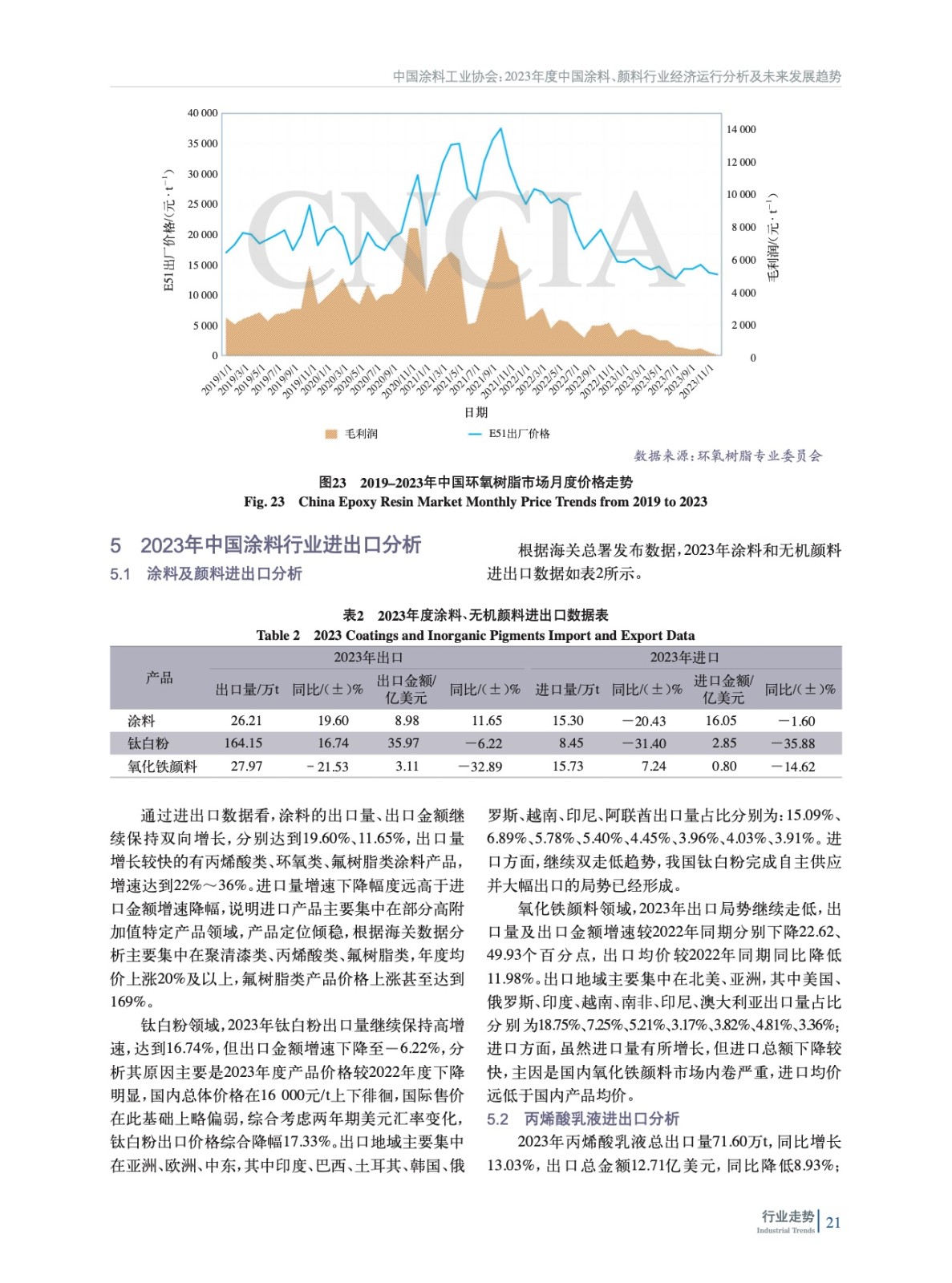 摘要:簡(jiǎn)析了2023年中國(guó)宏觀經(jīng)濟(jì)及外部環(huán)境發(fā)展情況,概括介紹了2023年涂料重點(diǎn)下游、新興領(lǐng)域發(fā)展概況及對(duì)涂料行業(yè)的影響,重點(diǎn)分析了2023年度中國(guó)涂料行業(yè)發(fā)展和進(jìn)出口情況,并對(duì)上游鈦白粉、氧化鐵、丙烯酸乳液和環(huán)氧樹(shù)脂領(lǐng)域發(fā)展情況進(jìn)行了概述。最后對(duì)中國(guó)涂料行業(yè)特征和發(fā)展趨勢(shì)進(jìn)行了分析和預(yù)測(cè)。