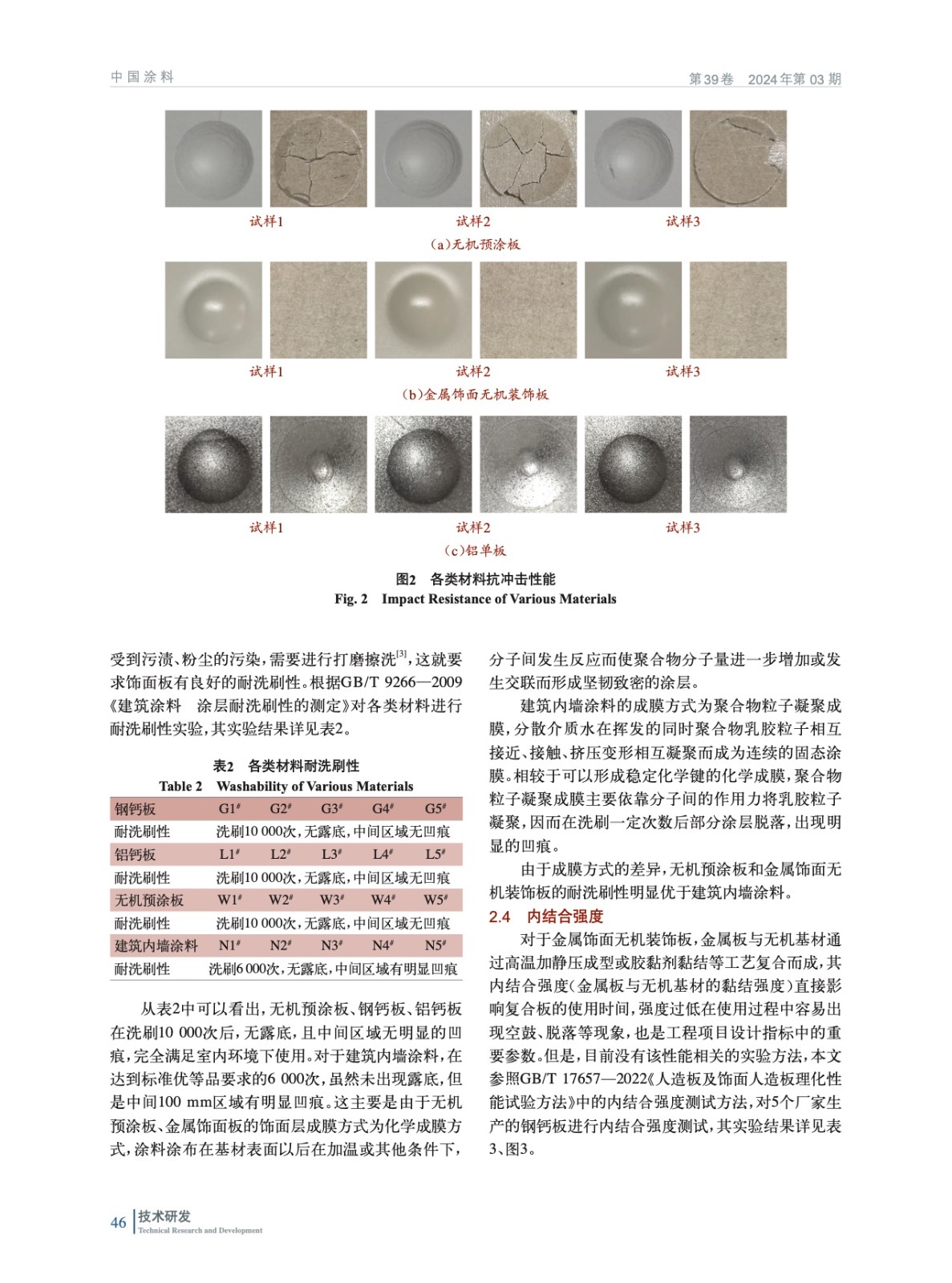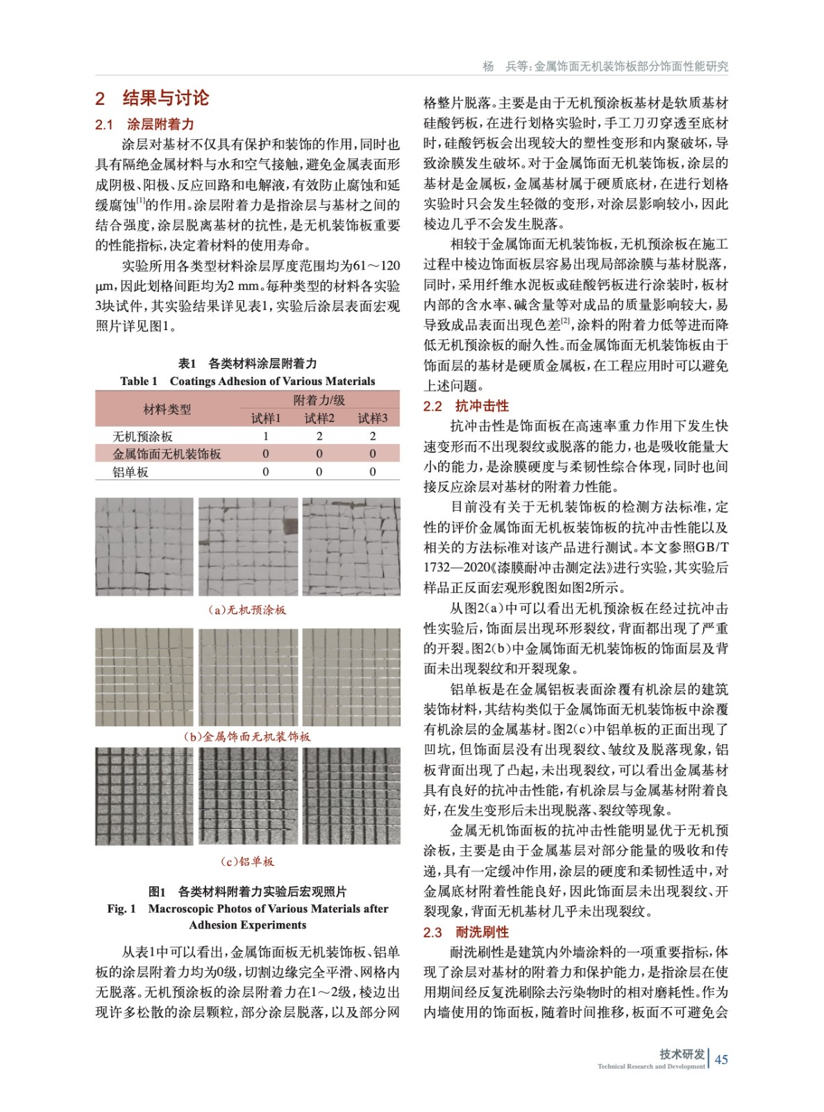 摘要:參照涂料相關的標準研究了金屬飾面無機裝飾板主要飾面性能及金屬板與無機板的黏結強度。結果表明:金屬飾面無機裝飾板具有卓越的涂層附著力、抗沖擊性能,涂層附著力等級為0級,切割邊緣完全平滑、網格內無脫落。30 cm高度的沖擊后,涂層未出現開裂,背面硅酸鈣板未出現凸起和裂紋,與金屬材料鋁單相當,可以替代部分鋁單板、搪瓷板,應用于軌道交通樞紐站、過街隧道等,以降低工程成本。由于成膜方式為化學成膜,洗刷10 000次后,金屬飾面無機裝飾板的飾面層中間100 mm長度的洗刷區無明顯凹痕;參照GB/T 17657—2022中的內結合強度方法測試金屬板與無機板之間的黏結強度,具有一定的可行性,金屬板與無機基材黏結處強度均在0.54 MPa以上,滿足室內環境下黏結面強度要求。