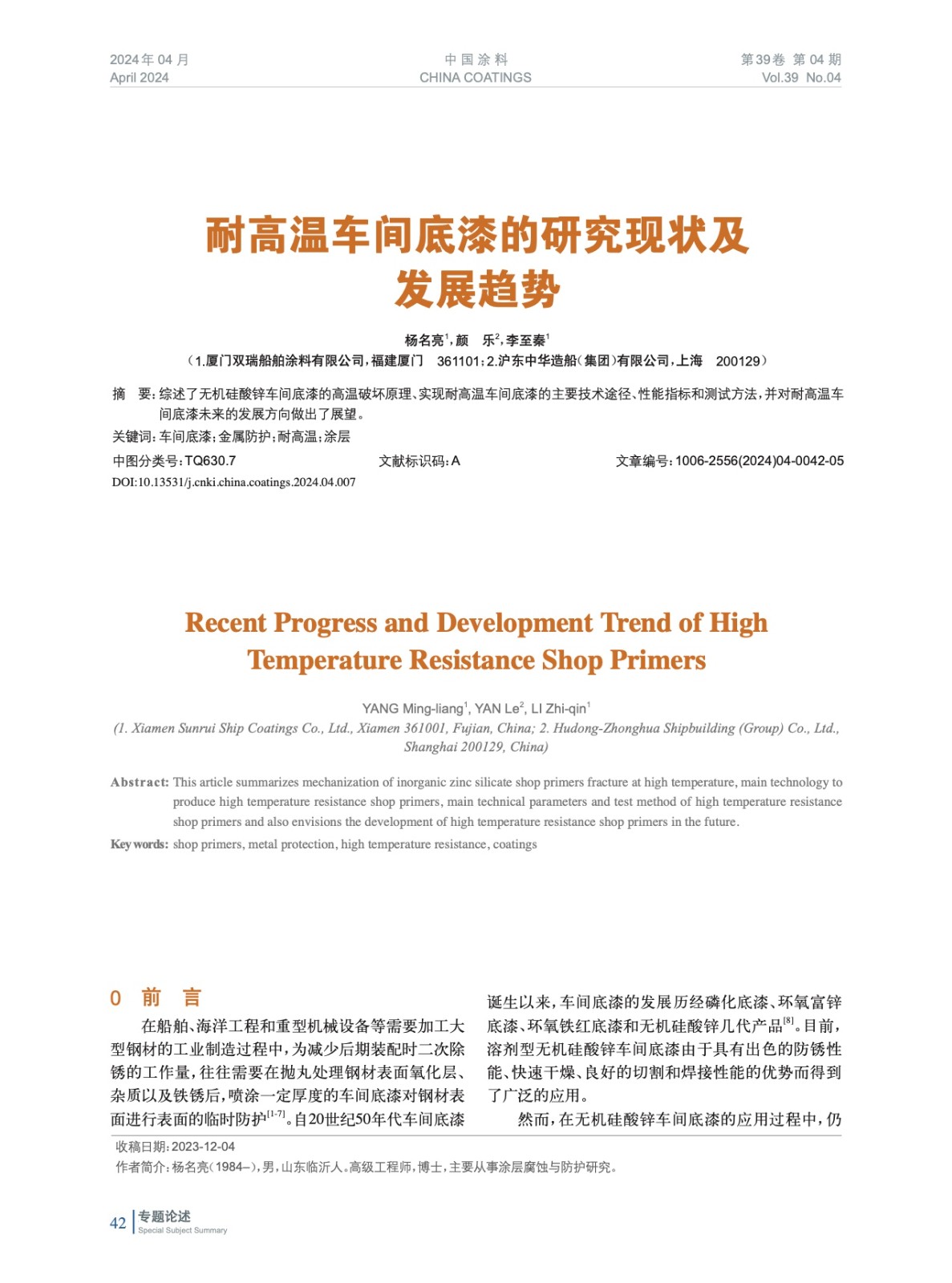 綜述了無機硅酸鋅車間底漆的高溫破壞原理、實現耐高溫車間底漆的主要技術途徑、性能指標和測試方法,并對耐高溫車間底漆未來的發展方向做出了展望。