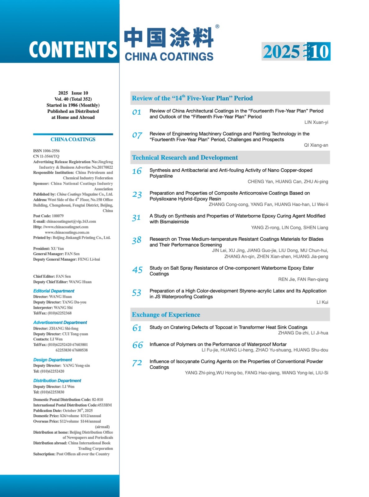 《中國涂料》2025年第10期版權及目錄