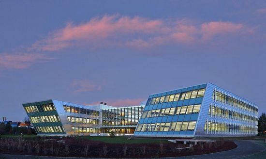 聯邦中心大廈,受2009年《美國復蘇與再投資法案》的資助,在5英畝的區(qū)域將聯邦中心南樓改建成,華盛頓州西雅圖西北區(qū)美國陸軍工程兵部隊總部。該建筑位列全美節(jié)能辦公建筑百強,并有望獲得美國“能源之星”的殊榮。建筑整體使用了可再生材料、可再生地板、可再生木材,是全美第一個使用復合地板系統(tǒng)的建筑。建筑排放的廢水經過過濾后匯集到池塘和雨水花園。其雨水再利用系統(tǒng)收集的雨水經處后可重新用于廁所沖洗、屋頂灌溉、還可為屋頂降溫。該系統(tǒng)可以減少80%飲用水的使用,并削減14%灌溉水需求。