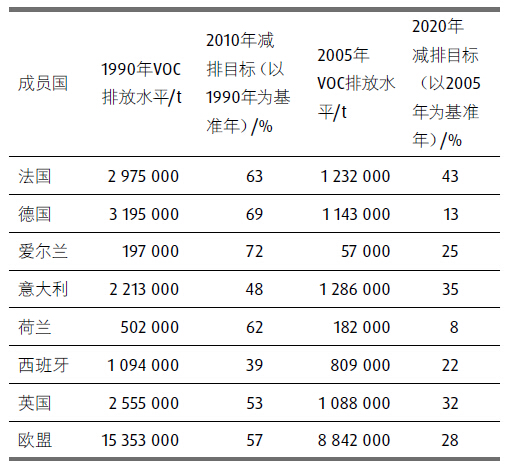 與1990年的排放相比,德國在2011年僅達(dá)到了減少NMVOC排 放69%(從3 195 000 t減少至995 000 t)的目標(biāo)。只有愛爾蘭采用 較嚴(yán)格的要求(72%)。由于未達(dá)到2010年的目標(biāo),德國2020年 設(shè)定的目標(biāo)值相同,減排要求非常低:相對于2005年的減排水平 (目前作為基準(zhǔn)年),減少13%的NMVOC排放(從1 143 000 t減少 至995 000 t)。在所有的國家中,德國的2020年的減排要求是最 低的。只有2個較小國家的減排要求更低:愛沙尼亞為10%,荷蘭 為8%。