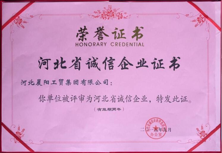 在河北省企業(yè)家協(xié)會(huì)等部門聯(lián)合開展的“河北省誠(chéng)信企業(yè)”評(píng)選活動(dòng)中,河北晨陽(yáng)工貿(mào)集團(tuán)有限公司被評(píng)為2015年“河北省誠(chéng)信企業(yè)”,董事長(zhǎng)劉善江榮獲“河北省企業(yè)誠(chéng)信建設(shè)優(yōu)秀工作者”稱號(hào)。
