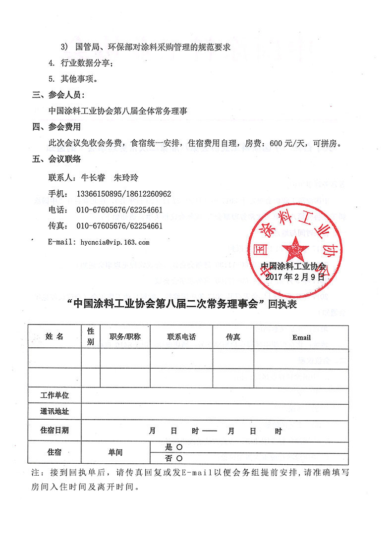 “中國涂料工業協會第八屆二次常務理事會”回執表