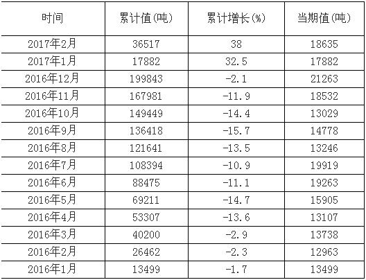 據數據庫數據顯示,2017年1-2月我國鈦白粉進口量累計36517噸,同比增長38%,其中2月進口量為18635噸。