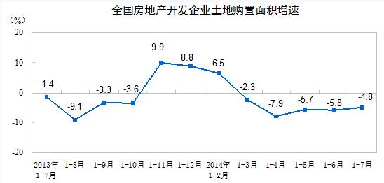 1-7月份,房地產(chǎn)開發(fā)企業(yè)土地購(gòu)置面積17824萬平方米,同比下降4.8%,降幅比1-6月份收窄1個(gè)百分點(diǎn);土地成交價(jià)款4828億元,增長(zhǎng)9.8%,增速提高0.8個(gè)百分點(diǎn)。