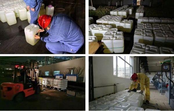 由于平時產品出廠時主要是以噸桶和罐車運輸,為了適應社會需要,氯堿熱電公司立即改造了充裝管線,從而適應小桶灌裝生產。采購部于當天采購了300只25公斤裝塑料桶,生產管理部和市場部于當天設計出適合小桶尺寸的消毒液說明標簽。從下午到晚上,接到指令的50多名員工立即加班加點配置生產消毒液。配置、分析、質檢、灌裝、粘貼標簽、裝車……萬華煙臺工業園開通了應急綠色通道,簡化出廠程序,保證消毒液在最短的時間內送達。