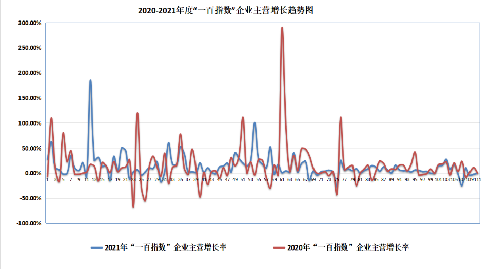 他還指出,從2020-2021年度“一百指數(shù)”企業(yè)主營增長趨勢來看,一百指數(shù)企業(yè)主營業(yè)務(wù)收入總和,相較于2020只有5.4%的增長來說,2021年取得了較為可喜的進(jìn)步,同比前一年增長17.5%。