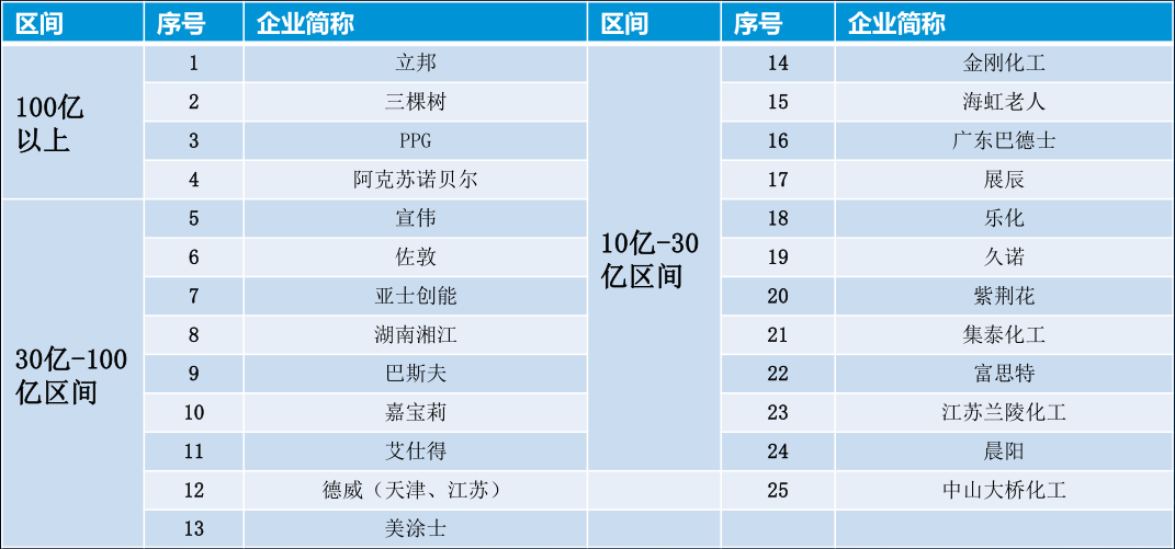 他還對行業(yè)“一百指數(shù)”企業(yè)進(jìn)行了概括分析。他表示,可喜的是,中國100億元以上的涂料企業(yè)已經(jīng)有四家,30~100億元的企業(yè)有9家,10~30億元的企業(yè)有12家,種種跡象表明,中國涂料已經(jīng)在由大而強(qiáng)的路上邁出了可喜的一步。