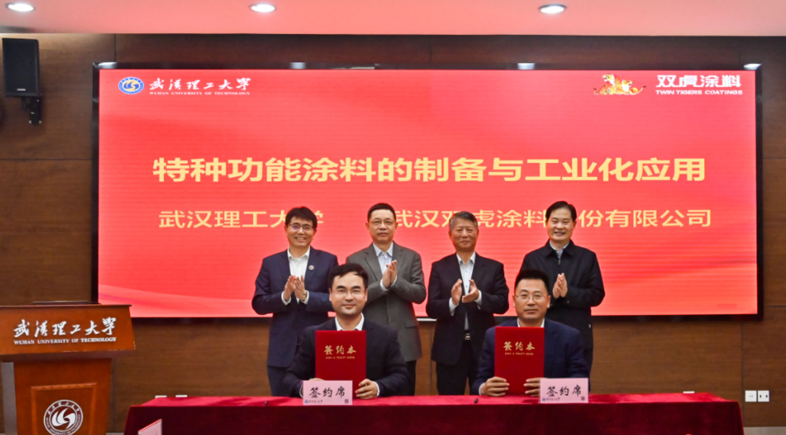 武漢理工大學科技合作與成果轉化中心主任胡劍與武漢雙虎涂料董事長蔣紅升代表雙方進行簽約。楊宗凱校長、鄒曉虹董事長共同為“武漢理工大學--雙虎涂料特種功能涂料研發中心”揭牌。