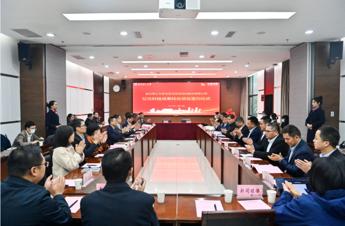 11月18日下午,武漢雙虎涂料股份有限公司與武漢理工大學特種功能涂料科技成果轉化合同簽約儀式在武漢理工大學會議中心舉行。