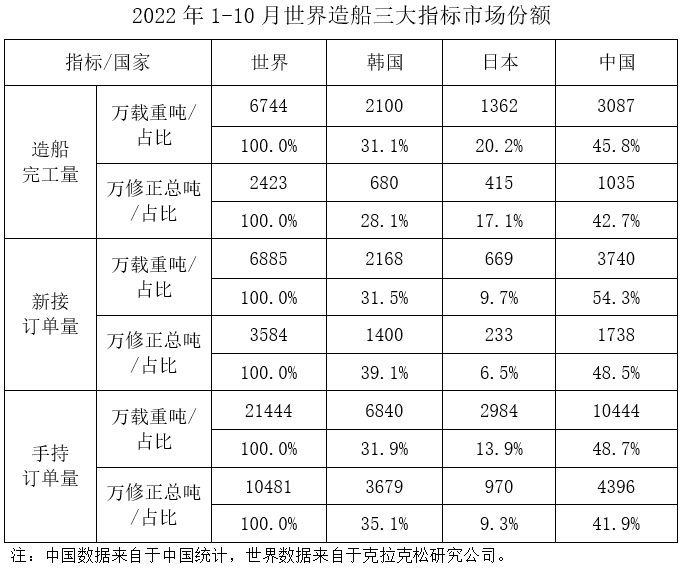 1~10月,我國(guó)造船完工量、新接訂單量、手持訂單量分別占世界市場(chǎng)份額的45.8%、54.3%和48.7%。
